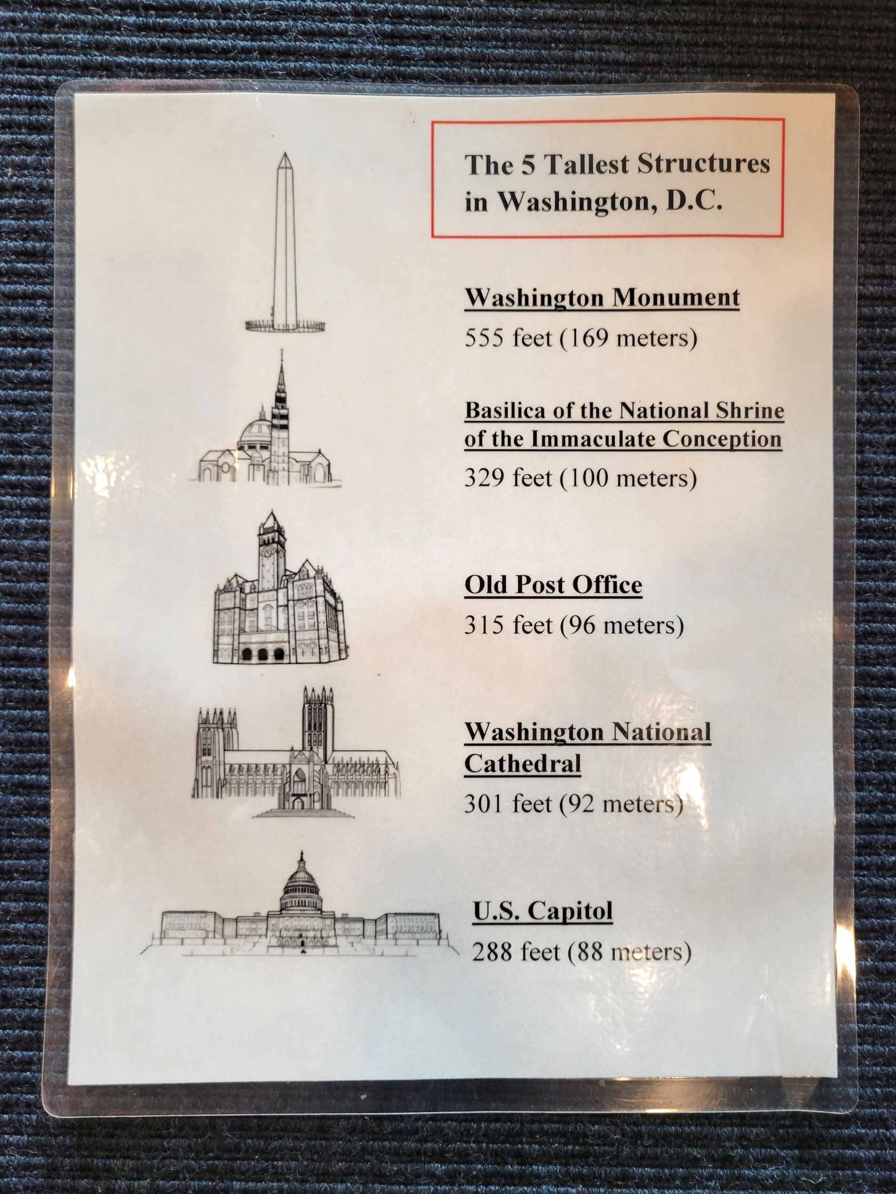 라디오 송신탑같은 구조물을 제외하고, 워싱턴DC에서 가장 높은 5개의 건축물을 차례로 보여주고 있는데, 이 시계탑은 최대 높이 315피트(96m)로 3등이다. 재미있는 것은 이제 전망대에 올라가면 나머지 4개가 모두 다 보인다는 점인데... 기대하시라~