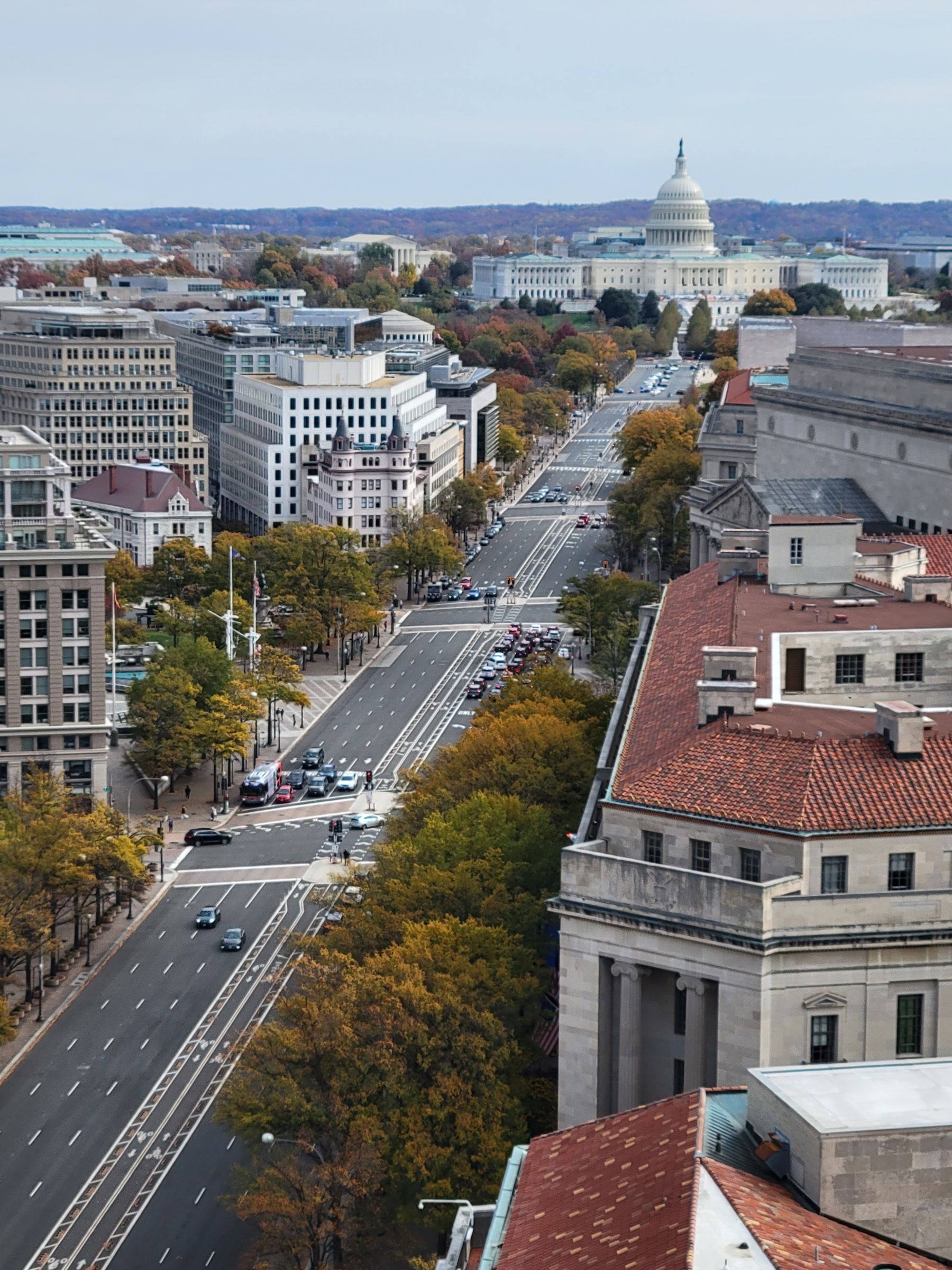 동쪽은 5등 국회의사당에서 백악관 방향으로 뻗어 오는 펜실베니아 대로가 늦은 가을 단풍 가로수와 함께 가장 잘 보였다. 길 오른편 Federal Triangle 구역의 연방청사 건물들 지붕을 모두 붉은 기와로 올린 것도 이채롭다.