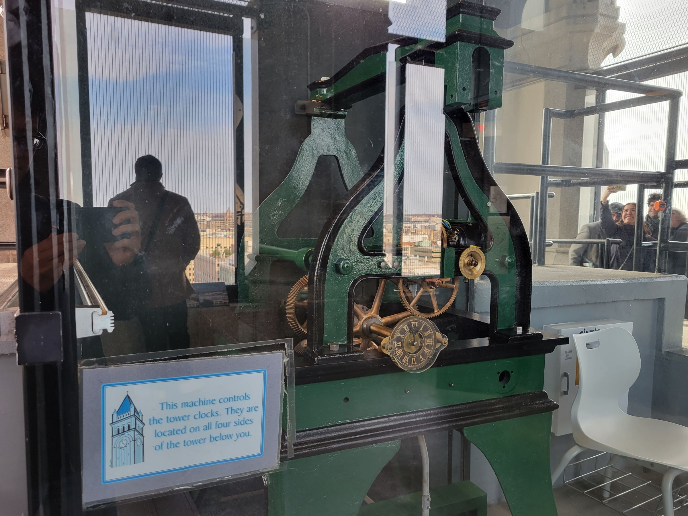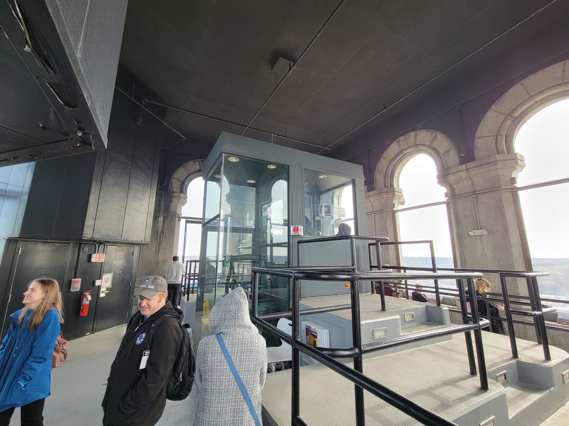 작은 엘리베이터에서 내리니까 제일 먼저 춥다는 느낌과 함께 좀 썰렁하다는 생각이 들었다. 보통 이런 꼭대기는 지금까지 종탑인 경우가 많아서 당연히 여러 개의 종이 있는 모습을 무의식적으로 상상했던 것 같다. 가운데 부분은 내려가기 전에 설명을 드리고, 시계탑에 올라왔으니 북쪽부터 '시계방향'으로 차례로 밖을 내다 보았다.