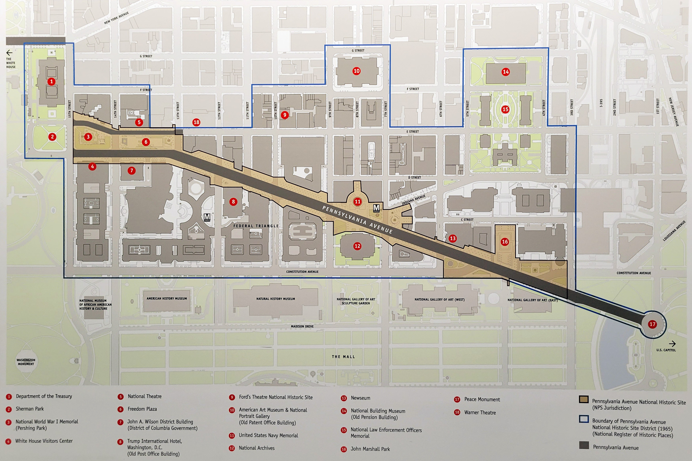 벽에 붙어있던 지도로 파란색 테두리의 안쪽이 1965년에 독립적인 펜실베니아애비뉴 국립사적지(Pennsylvania Avenue National Historic Site)로 지정이 되었는데 지금 건물은 ⑧번 위치이다. 이미 블로그에 소개한 여기 포함되는 곳들로는 ③번 제1차 세계대전 기념물, ⑨번 포드 극장, ⑩번 스미소니언 초상화/미국 미술관, ⑫번 국립 문서보관소 등으로 각각 이름을 클릭해서 보실 수 있다. 그 중에 국립공원청이 관리하는 곳들을 묶어 카테고리를 새로 만들었고, 아마도 국립사적지의 다른 나머지 장소들을 방문한 한두편은 더 추가가 될 것 같다.