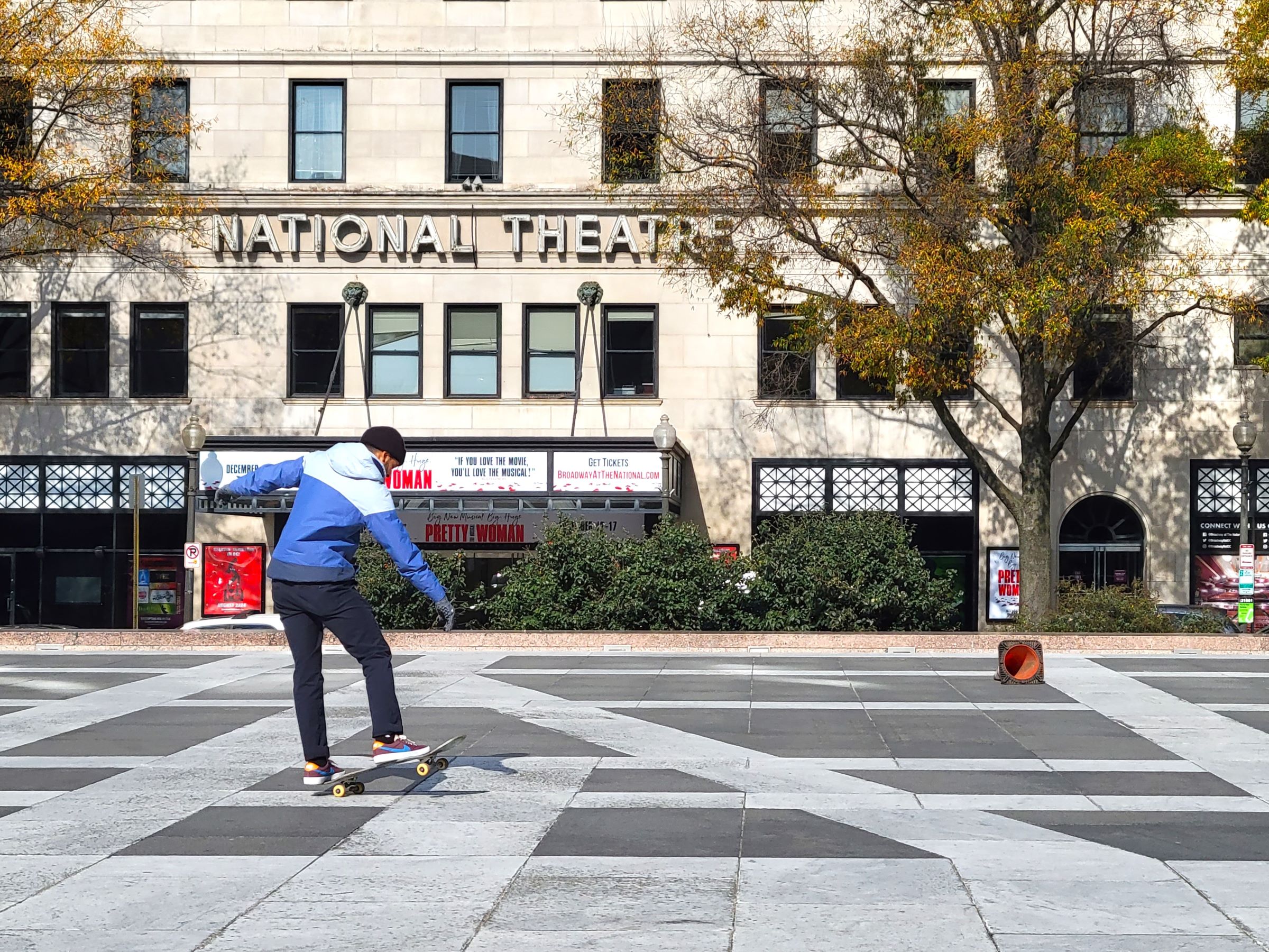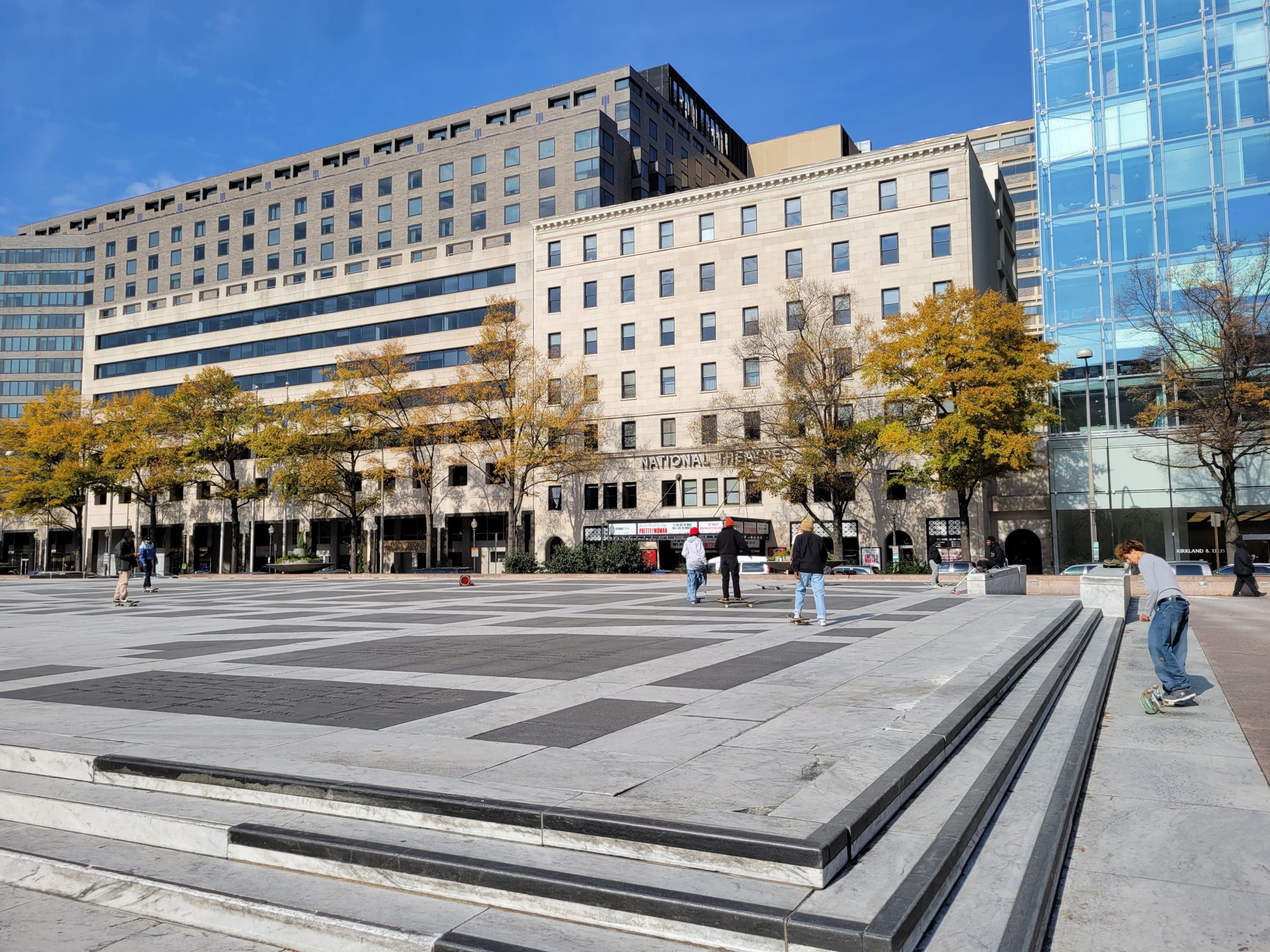 동상이 서있던 곳은 넓고 평평한 프리덤 플라자(Freedom Plaza)의 동쪽 끝이다. 이 광장은 사진처럼 스케이트보드 타는 사람들에게 인기라는데, 국립공원청이 공식적으로는 금지하지만 거의 묵인하는 수준이란다.^^ 넓은 바닥에는 전편에 보여드린 것처럼 의사당에서 백악관까지의 지도가 그려져 있고, 두 건물의 평면도까지 자세히 바닥에 새겨져 있었다.