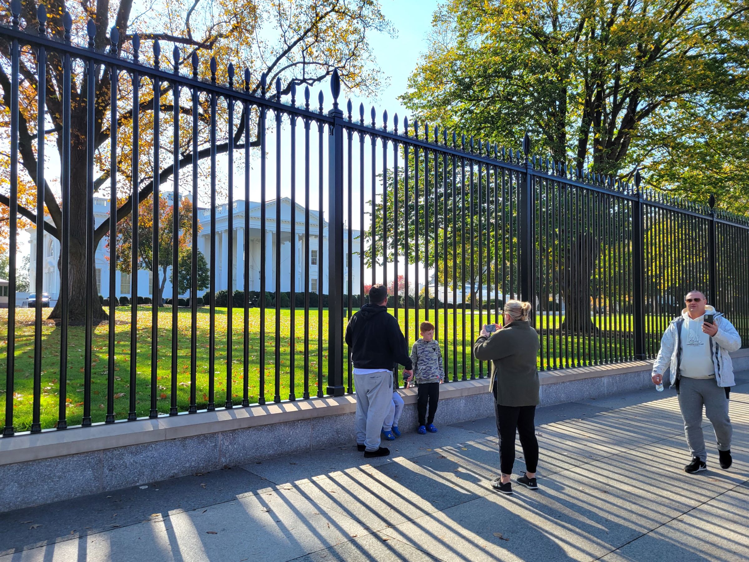 주소가 '1600 Pennsylvania Ave, Washington, DC'인 그 집이 높은 철제 담벼락 너머로 보인다.