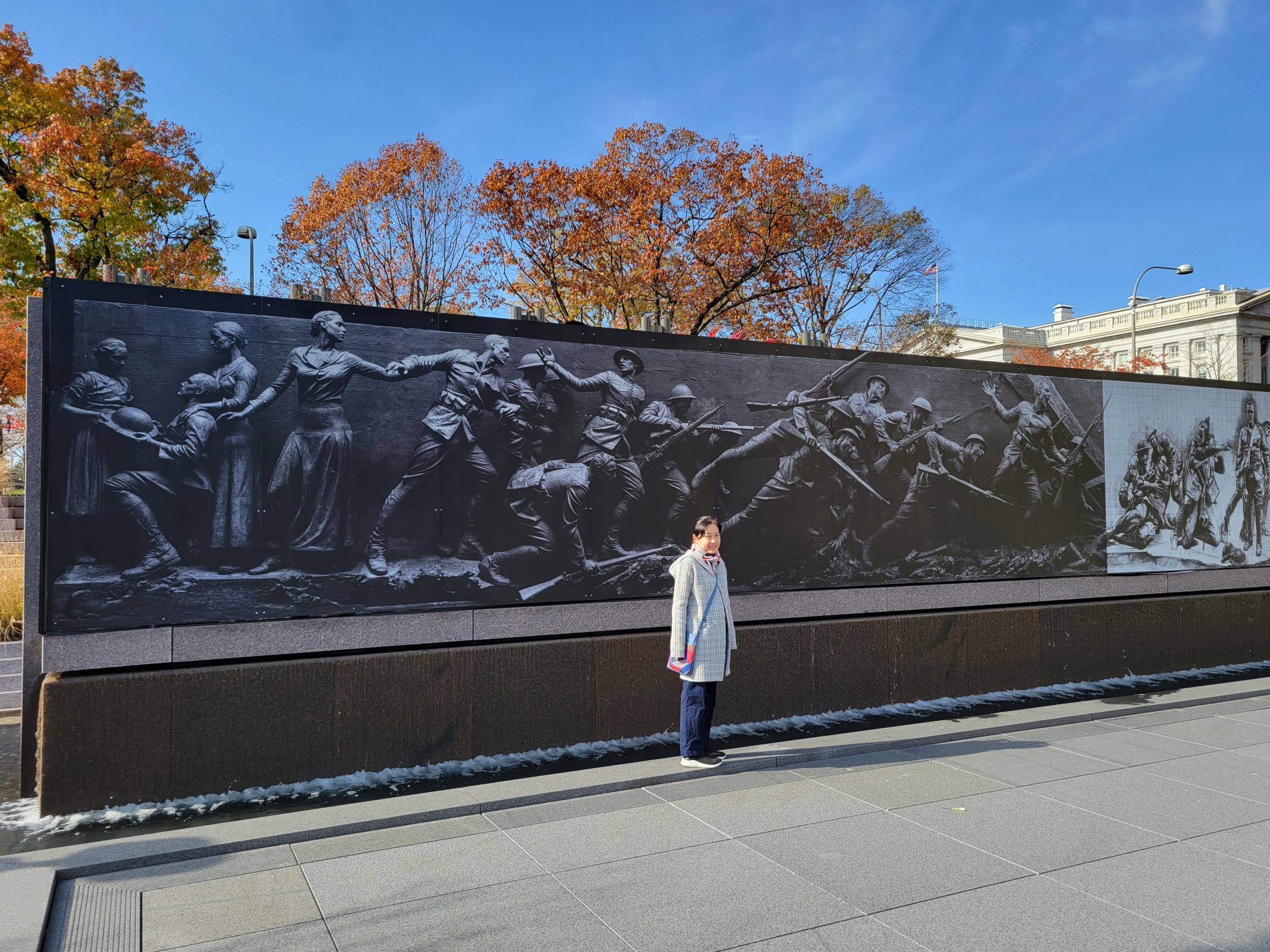 가까이 가서 보니 까만 부분도 동상이 아니라 그림 또는 사진이었다. (저 통쾌하게 비웃으시는 표정^^) 따로 세워진 안내판에 따르면 38개의 인물상으로 만들어지는 "A Soldier's Journey"는 2024년에 전체가 완성되어서 여기 설치될 예정이란다~
