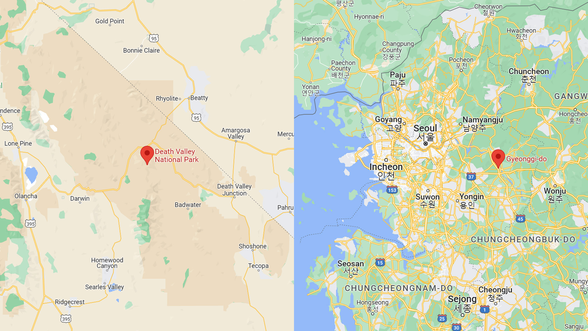 데스밸리와 경기도 지역을 비슷한 축척으로 비교한 구글맵으로, 데스밸리 국립공원의 면적이 서울, 인천, 경기를 합친 것보다 넓어서, 알래스카를 제외하면 미본토에서 가장 면적이 넓은 내셔널파크입니다!