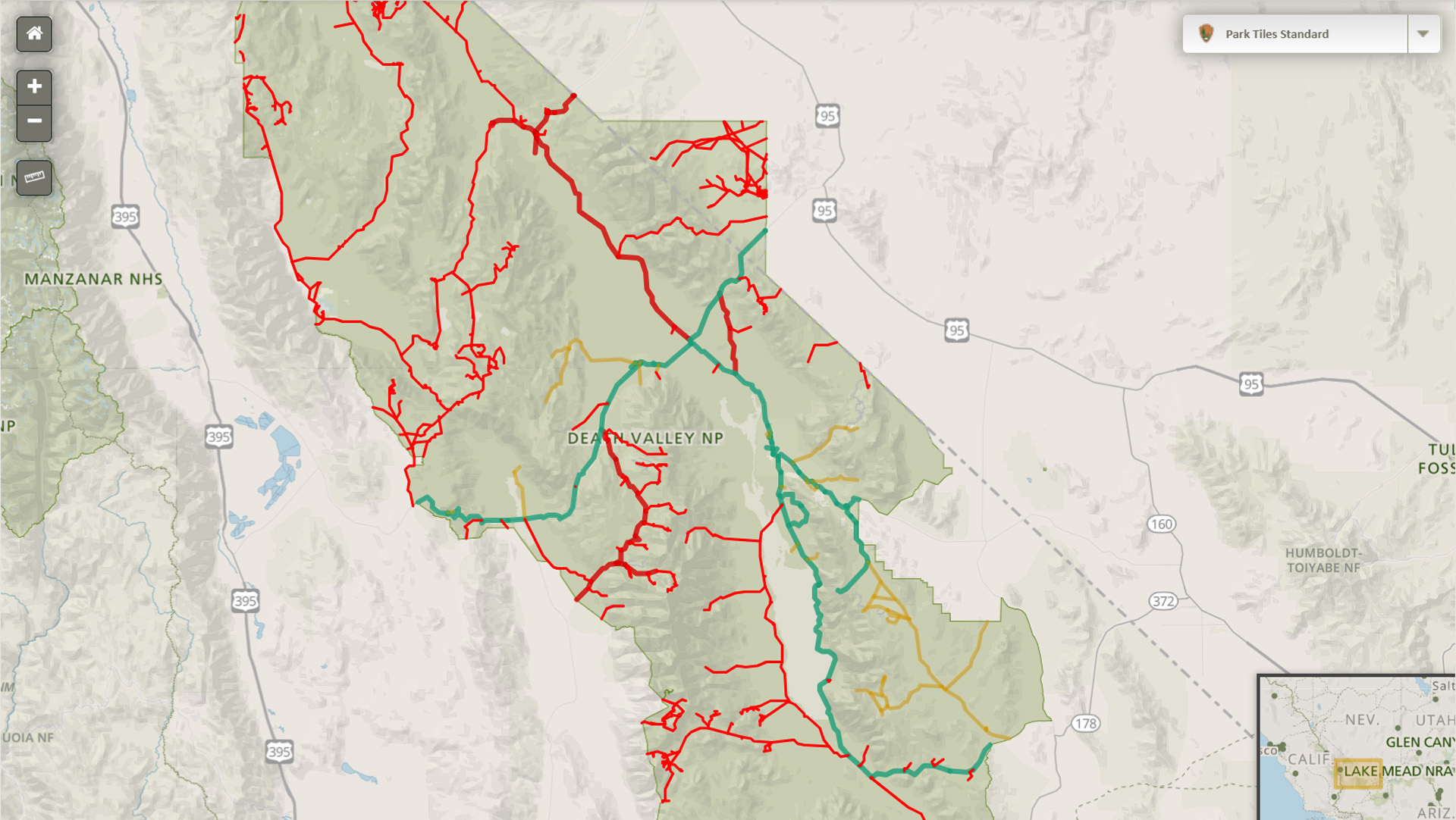 최근의 홍수로 인해서 공원을 동서로 관통하는 190번 도로를 제외한, 빨간색으로 표시된 대부분의 포장/비포장 도로가 2023년말 현재 통행이 불가한 상태입니다. 일반적인 관광객이 대표적인 포인트들만 구경하는데는 큰 문제가 없지만, 동영상에 소개한 산맥에 있는 와일드로즈 숯가마(Wildrose Charcoal Kilns)나 또는 신기하게 바위들이 저절로 움직이는 레이스트랙 평원(Racetrack Playa) 등은 현재 접근이 불가하므로, 데스밸리 여행계획이 있으신 분들은 홈페이지에서 도로 상황을 꼭 확인하시기 바랍니다.