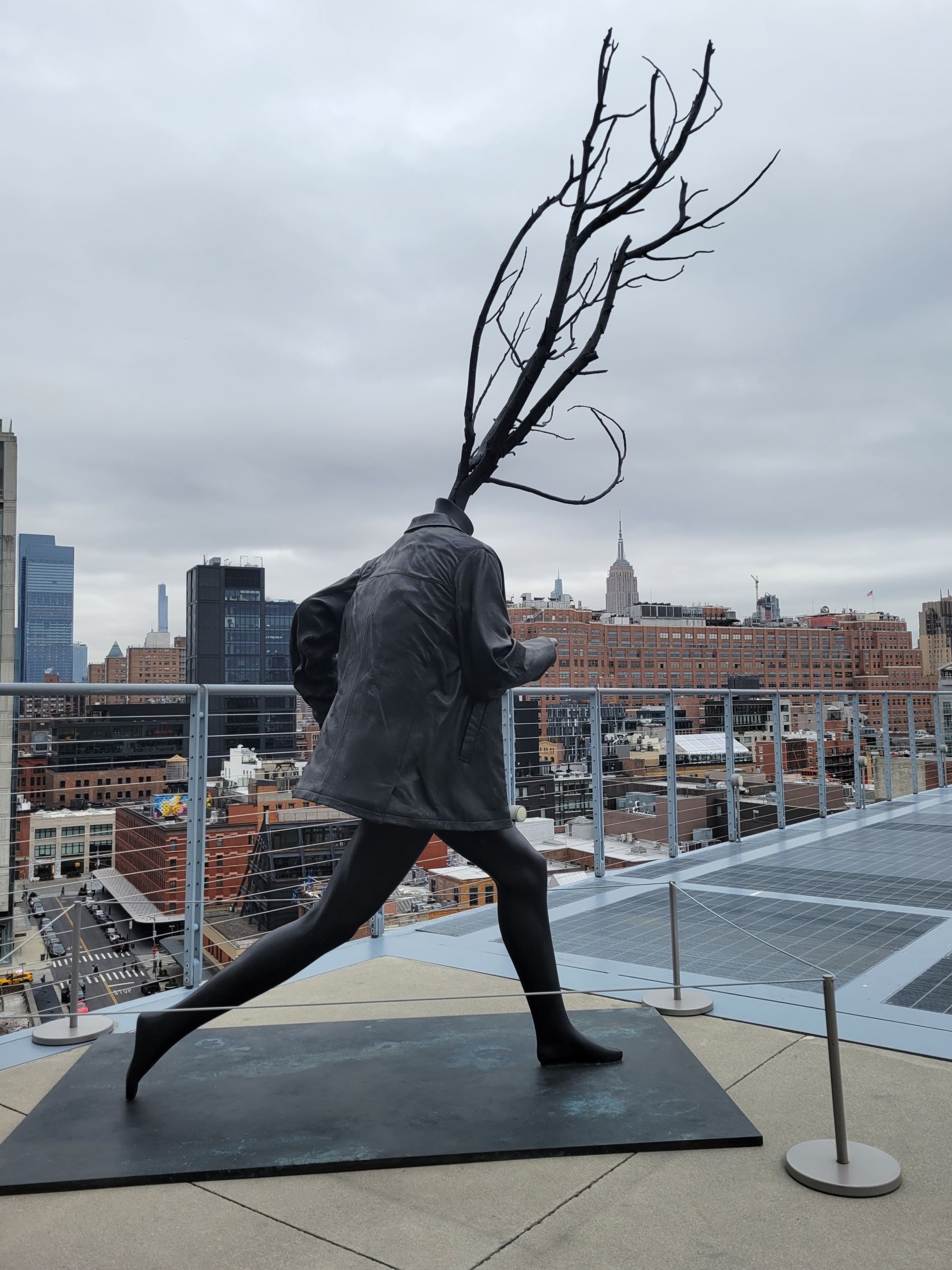 전시장과 연결된 밖의 테라스로 나가보니까 상의만 걸치고 머리에서 나무가 자라게 달리고 있는 사람이 있었다. 동상을 지나서 바닥이 숭숭 뚫어져 있는 철제 발판을 따라서 끝까지 걸어가서 내려다 보면,