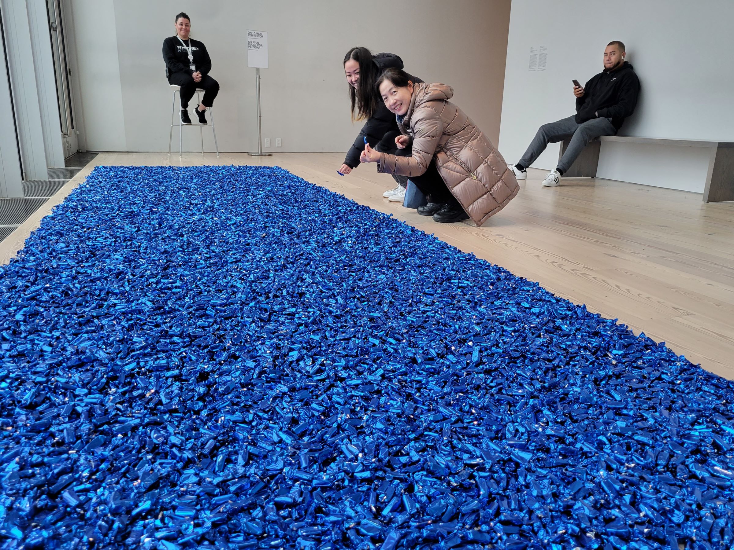 실내로 들어오는 바닥에 잔뜩 깔려있는 것은 파란 셀로판지에 싼 카라멜인데, 앉아서 지키고 있는 직원이 하나씩 집어서 먹어도 된다고 했다. 그래서 즐겁게 하나씩 까서 먹으며 벽에 적힌 작품설명을 읽어 봤는데... 카라멜은 AIDS로 죽은 남자 친구와의 기억을 상징하는 것으로, 관람객이 집어가는 만큼 그 기억이 사라진다고! 다행인 것은 직원이 카라멜을 추가로 가져와서 줄에 맞춰 다시 예쁘게 바닥에 깔면 그 기억들도 다시 돌아온단다.