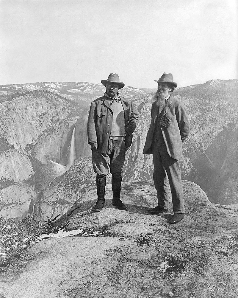 위기주부가 미국의 국립공원 시스템에 관심을 가지게 만든 이 흑백사진 한 장은 꼭 보여드리고 싶은데, 루즈벨트 대통령이 1903년에 요세미티 국립공원을 방문해서 존 뮤어(John Muir)와 함께 글레이셔 포인트에 오른 사진이다. 그는 목장 생활을 한 경험으로 캠핑같은 야외 활동에 익숙했고, 특히 뛰어난 사냥꾼으로 유명했다. 봉제 곰인형을 테디베어(teddy bear)라고 부르는 이유도 그의 이름 Theodore의 애칭인 Teddy에서 유래한 것은 잘 알려진 사실이다.