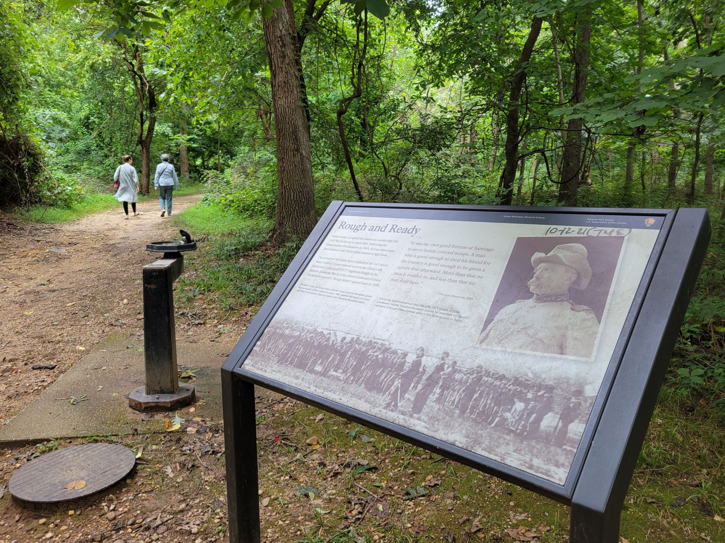 이 섬은 작년 벚꽃구경 포스팅의 마지막에 잠깐 소개했던 조지 메이슨 가문이 대대로 소유해서 원래는 메이슨 섬(Mason's Island)으로 불렸는데, 남북전쟁 때 연방정부가 점령해서 군부대를 만들고 흑인 병사들 훈련장으로 사용했단다. 안내판의 큰 사진은 1898년 쿠바에서 벌어진 미국-스페인 전쟁에 "Rough Riders"라는 의용병을 끌고 참전한 루스벨트로 함께 싸운 흑인 부대를 칭찬한 그의 말이 왼편에 적혀있다.