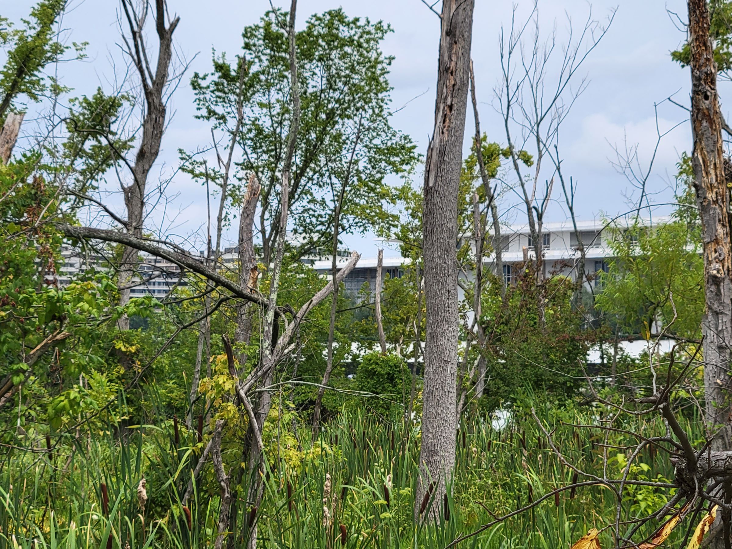 섬 동쪽으로 오면 강 건너 케네디 센터(Kennedy Center)와 워터게이트 호텔(Watergate Hotel)이 잘 보일 줄 알았는데, 이렇게 둘 다 나무와 덤불에 가려서 깨끗이 보이지는 않았다. 계속 북쪽으로 섬을 한바퀴 돌 수도 있지만, 그럴 필요는 없을 듯 해서 뒤돌아 돌아가기로 했다.