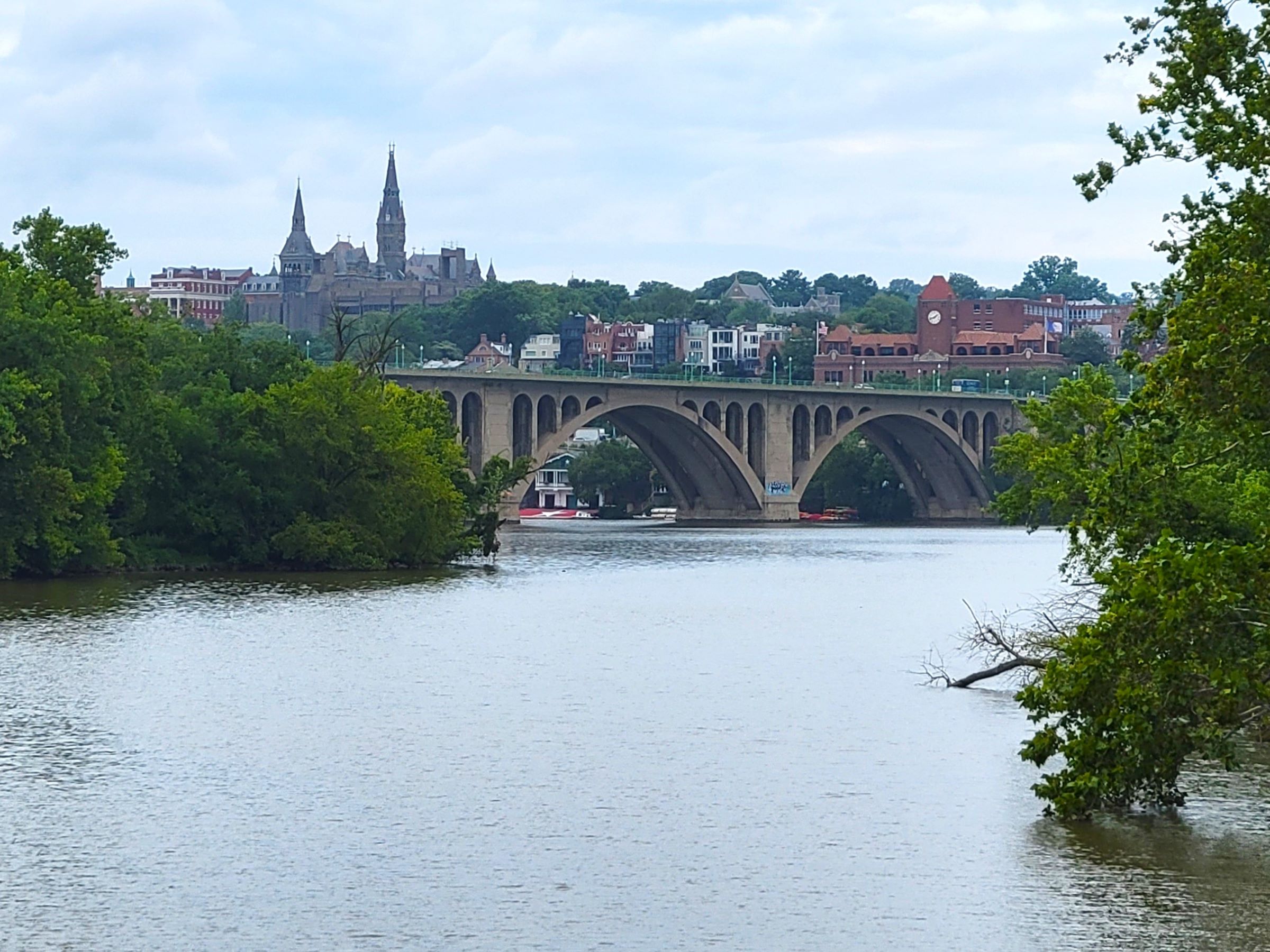 보행교를 건너다가 북쪽을 바라보면, 키브리지(Key Bridge)의 멋있는 아치와 조지타운(Georgetown) 대학교 건물의 첨탑이 어우러져서 마치 유럽 어디의 풍경을 보는 듯 한데, 여기를 클릭해서 저 동네를 돌아다닌 여행기를 보실 수 있다.