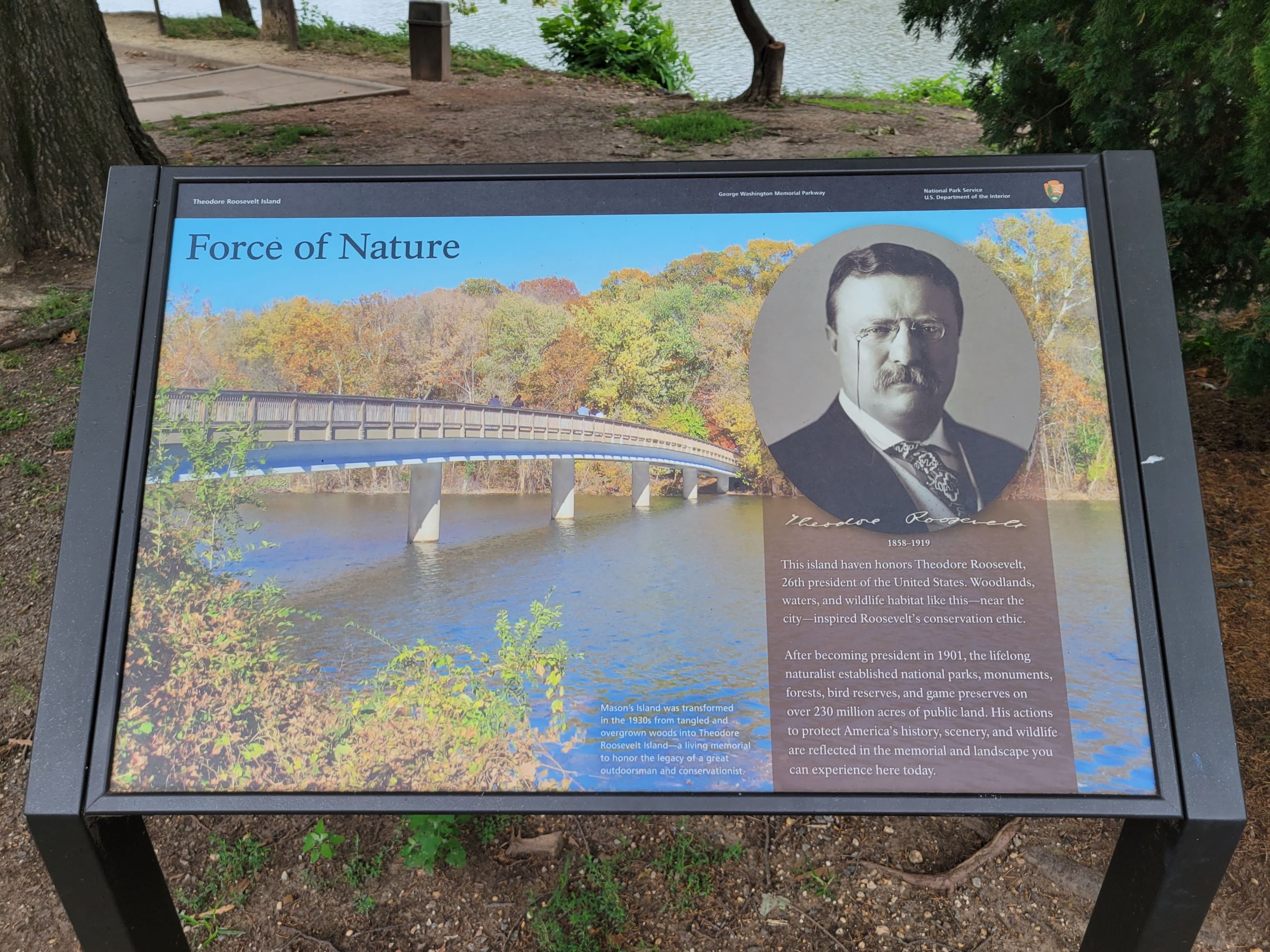 제26대 대통령 시어도어 루즈벨트(Theodore Roosevelt)에 대해서는, 뉴욕 롱아일랜드에 있는 그의 저택을 방문했던 여행기에서 자세히 설명을 드렸었는데, 이제 사진의 다리로 건너가려고 하는 섬 전체가 워싱턴DC에 있는 그를 기리는 '살아있는 기념물(Living Memorial)'이다. 자연주의자(naturalist)였던 그는 1901년에 얼떨결에 대통령이 된 후에 많은 국립공원, 모뉴먼트, 국유림 등을 지정해서 미국의 자연을 보호하는데 크게 기여했으며, 특히 두번째 임기중인 1906년에 유물법(Antiquities Act)을 제정해서, 연방정부 소유의 땅을 대통령의 행정명령으로 국가기념물(National Monument)에 지정해서 보호될 수 있도록 한 것이 중요한 관련 업적으로 꼽힌다.