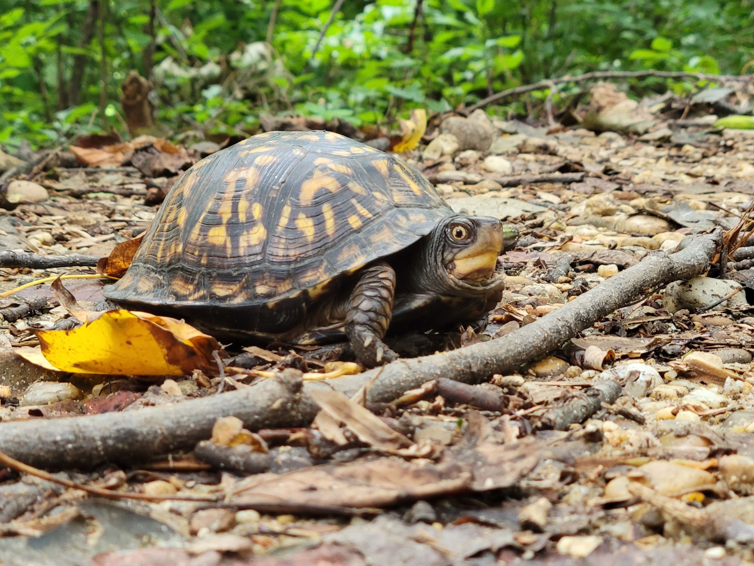 그런데, 트레일에 뭔가 커다란게 천천히 움직이고 있어서 가까이 가보니 국그릇을 엎어놓은 듯한 크기의 거북이였다! 이미지 검색을 해보니까, 이스턴박스터틀(Eastern Box Tutle) '북미 상자거북'으로 미동부에서는 굉장히 넓은 지역에 서식하는 흔히 볼 수 있는 종으로, 한국에서는 애완용으로 키우시는 분들이 있단다.