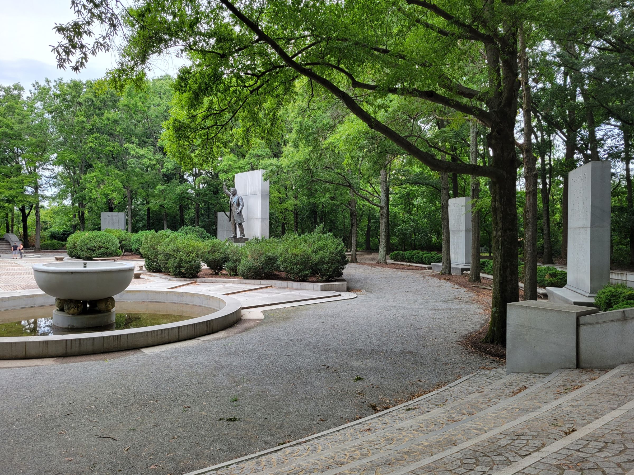 그런데, 동상만 있는게 아니라 중앙의 넓은 광장에 2개의 분수대를 비롯해서, 저 너머 사람들이 건너온 계단과 그 아래에는 인공 연못도 광장을 감싸며 좌우로 만들어져 있었다. 섬의 숲속에 만들어져 있다는 점에서 이전의 LBJ 기념물과 함께 리빙메모리얼(Living Memorial)로 불리기는 하지만, 의외로 인공적인 구조물이 크게 만들어져 있어서 좀 놀랐던 기억이다.