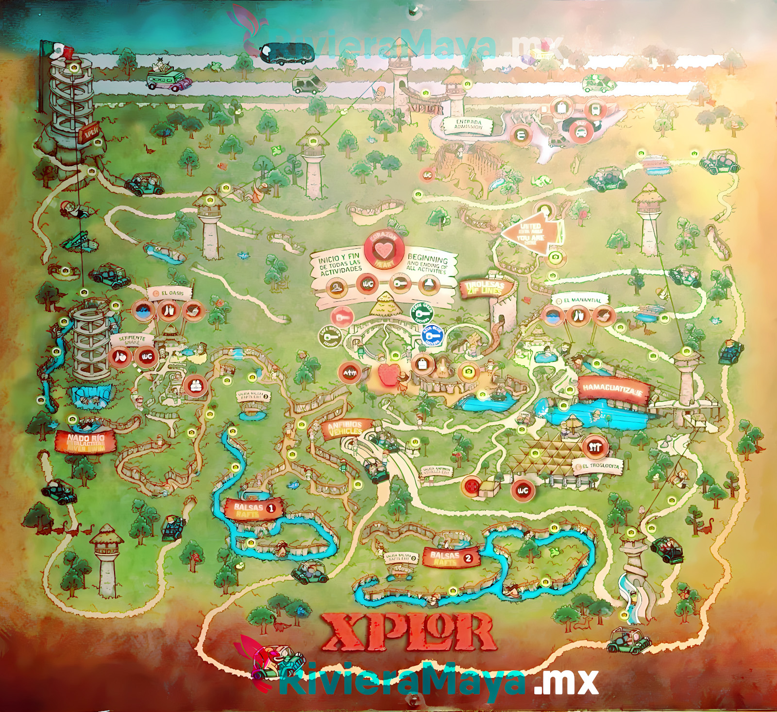 액티비티 중심의 테마파크인 스플로르(Xplor)의 그림 지도로, 높은 타워들을 연결하는 집라인(Zip-lines)과 공원 구석구석을 누비는 오프로드 ATV 및 놀이공원에 대한 일반적인 소개는 여기를 클릭해서 1편을 보시면 된다. 이제 파란색으로 표시된 물길을 따라 배를 타고 수영을 한 이야기인데, 중앙의 빨간 하트 바로 오른쪽에 있는 넓은 호수를 제외한 나머지 좁은 물길들은 모두 지하 동굴 속에 있다!