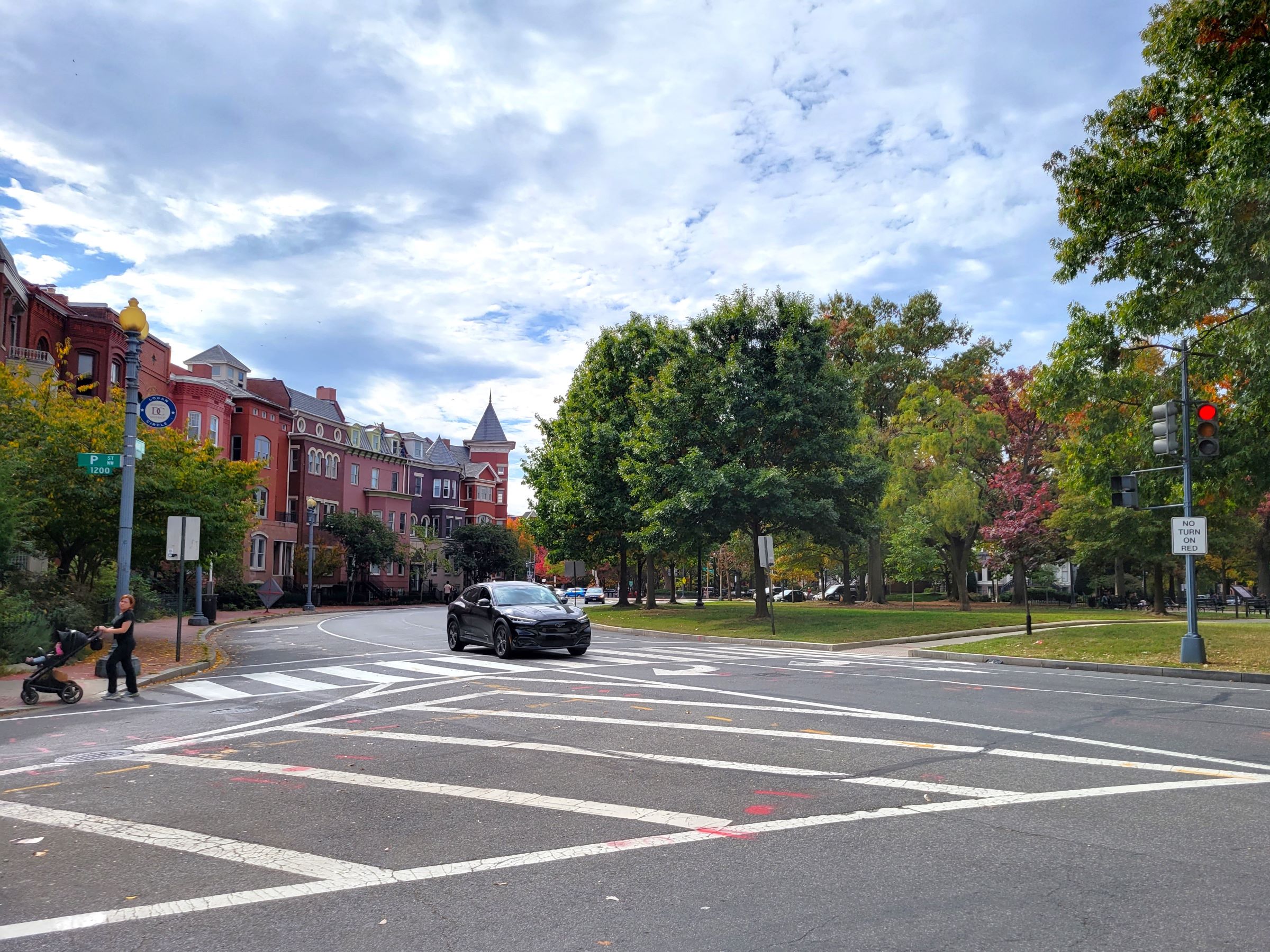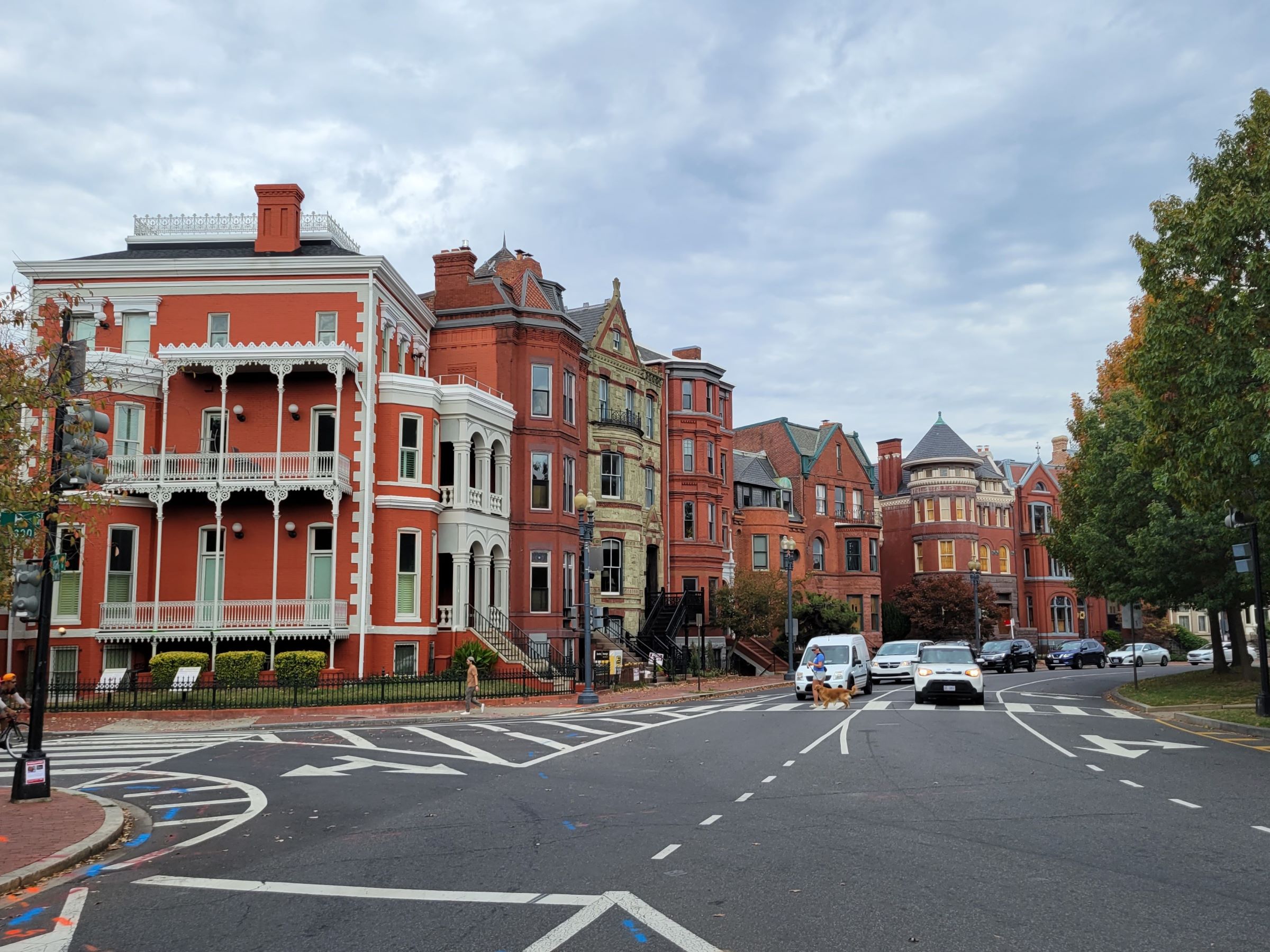 여기서 정서 방향에 있는 2011년 미동부 여행에서 숙박했던 듀퐁서클(Dupont Circle)은 상업지구로 개발된 반면에, 로간서클은 옛모습을 그대로 간직한 주택가로 남아있는게 큰 차이점이다. 이 예쁜 집들의 제일 북쪽에 목적지가 있는데, 다시 로터리 공원 안을 지나서 걸어간다.