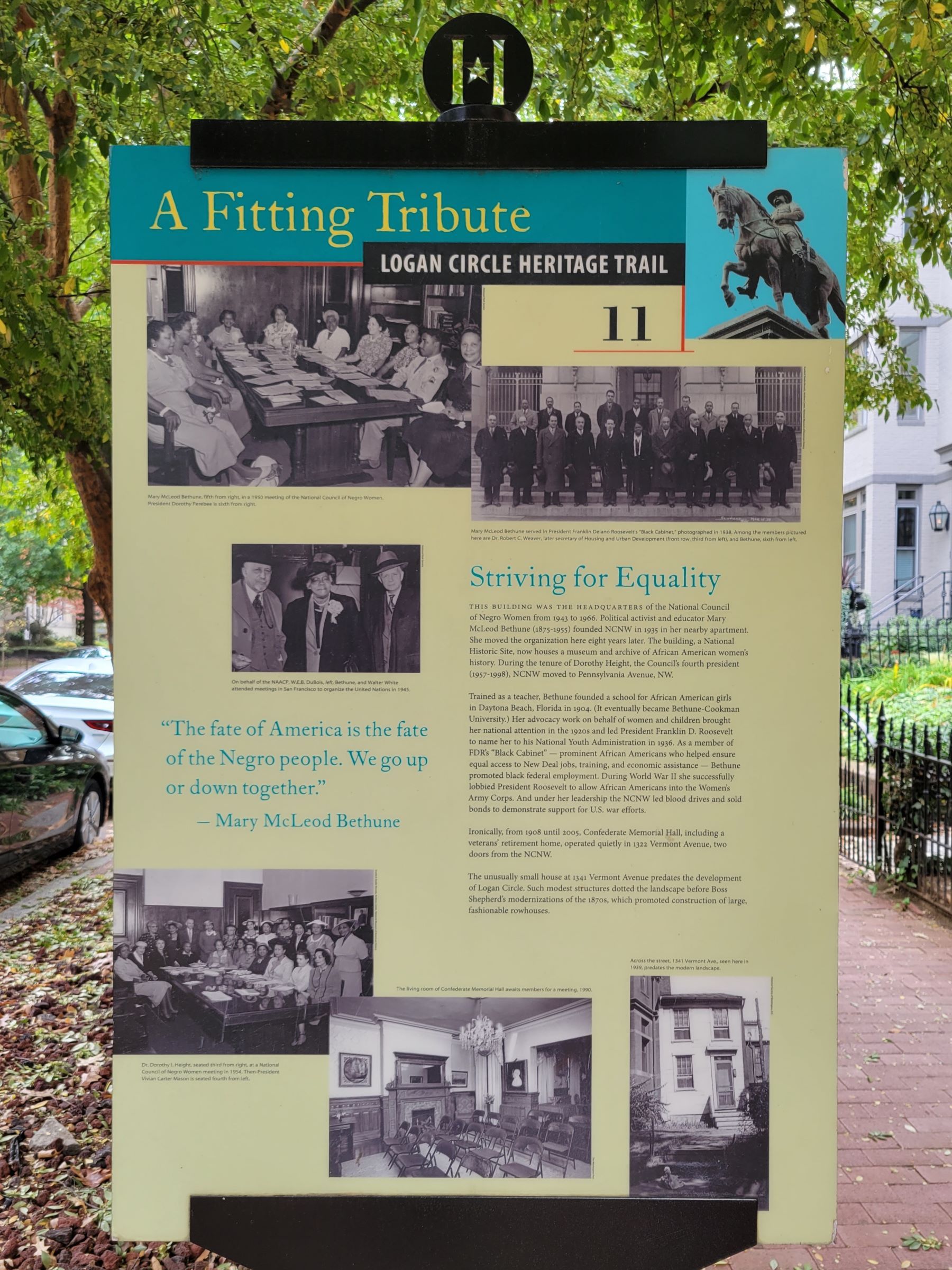 로간서클 역사지구 안내판에 메리 매클러드 베튠(Mary McLeod Bethune, 1875~1955)에 대한 소개와 사진들이 있다. 사우스캐롤라이나에서 역시 노예의 딸로 태어났던 그녀는 학교를 만들어 흑인 소녀들에게 글을 가르치다가, 1935년에 FDR 대통령의 자문위원이 되어 DC에 와서는 전미흑인여성회(National Council of Negro Women)를 조직해서 권리신장과 평등을 위해 여생을 바쳤다.