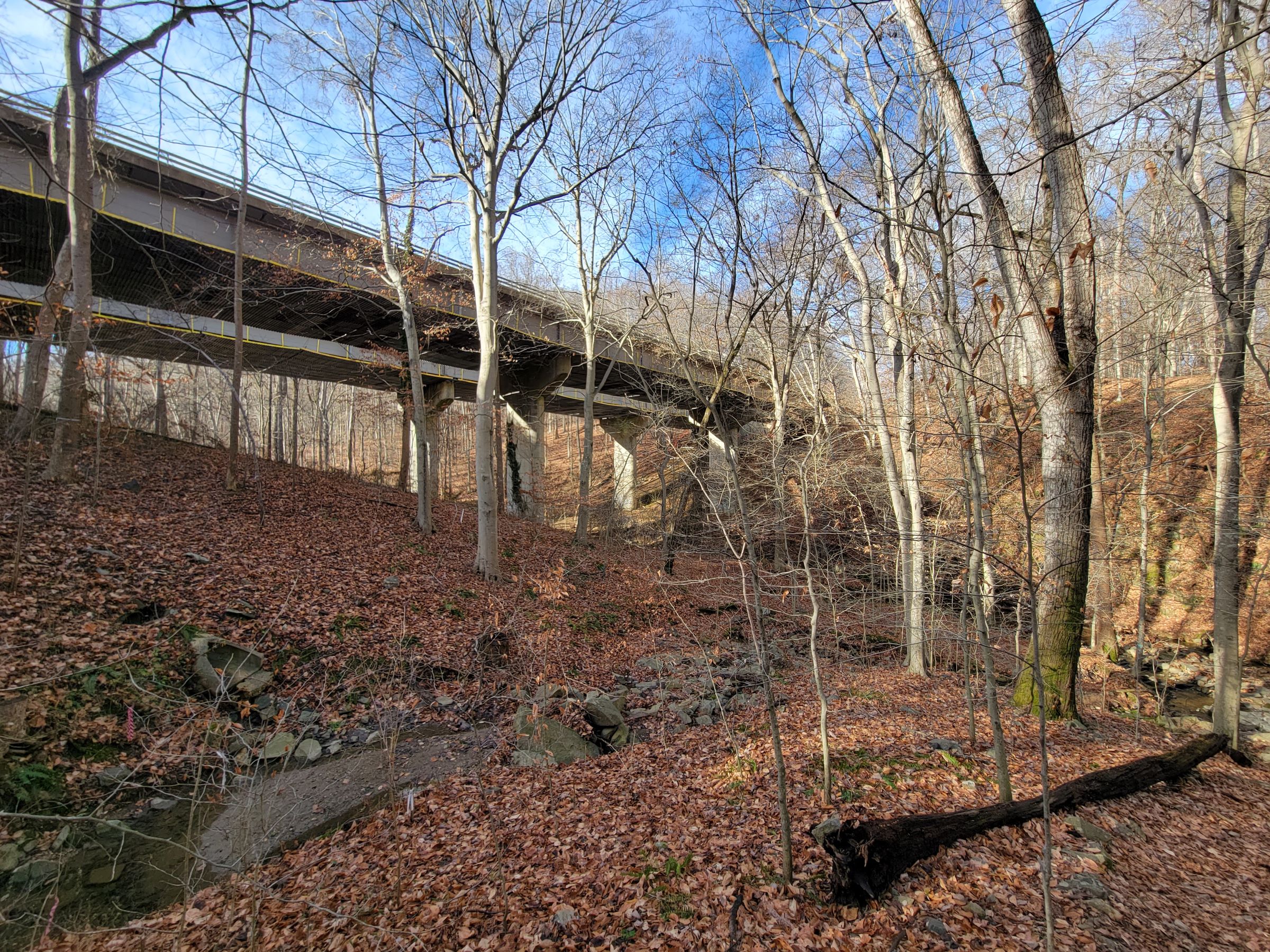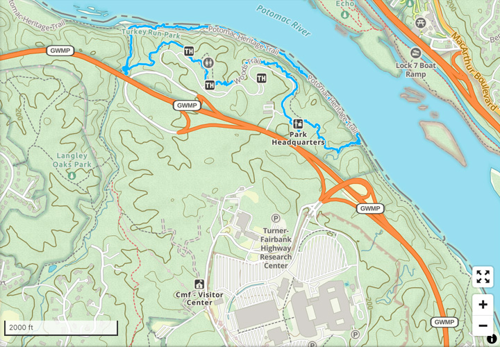 다시 재미없는 하이킹 이야기로 돌아와서, 위의 지도에 GWMP라 표시되어 있는 굵은 주황색의 조지워싱턴 기념도로(George Washington Memorial Parkway)가 고가로 지나가는 칠면조 개울(Turkey Run)까지 걸어왔다.