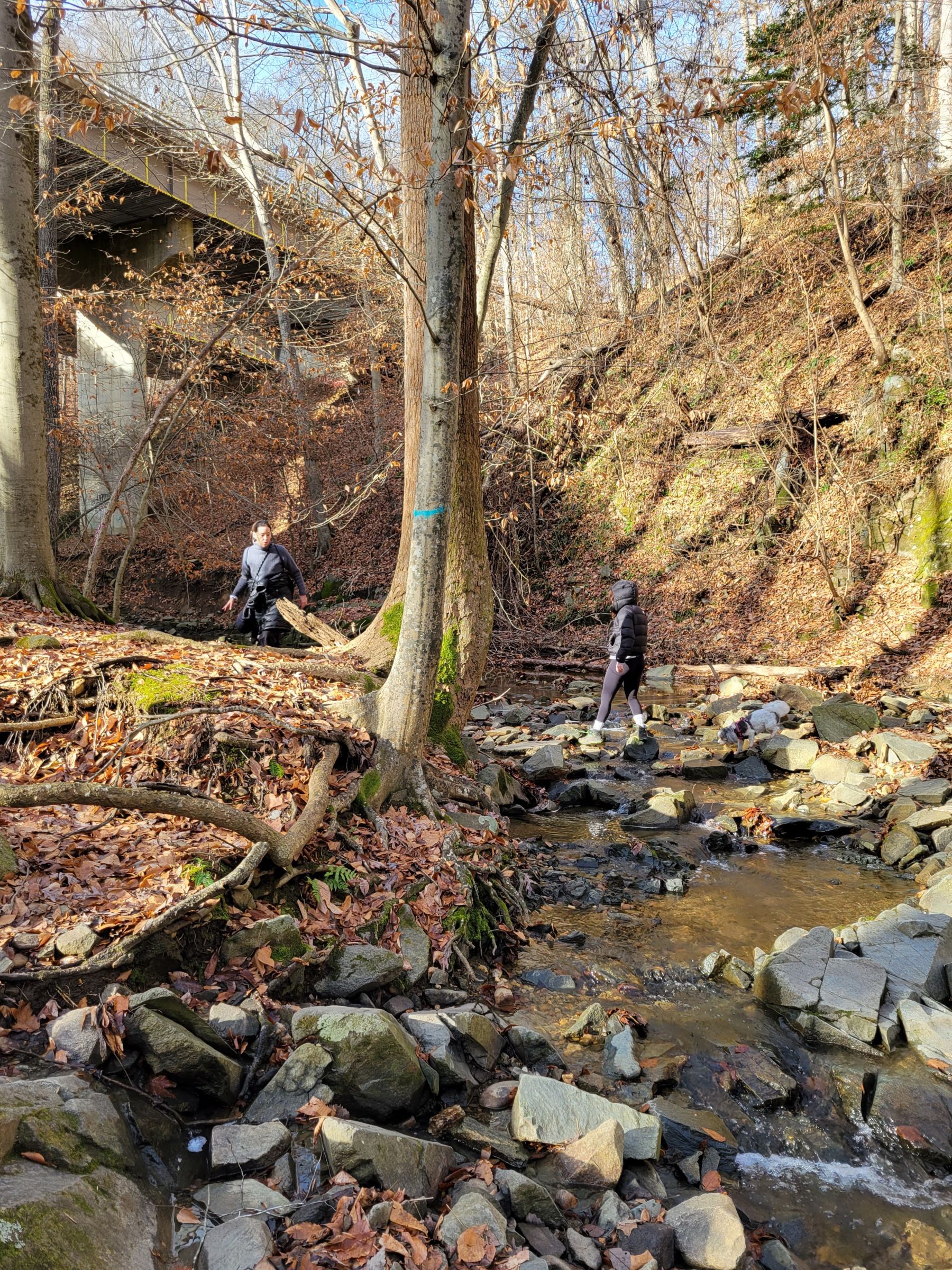 개울을 건너다 이 날 하이킹 중에 유일하게 마주친 분들로, 위기주부가 출발한 공원 주차장이 아니라 계속해서 남쪽 상류로 거슬러 올라갔다. "혹시 인적이 드문 숲을 가로질러 CIA 본부에 침투하려는 스파이...? ㅎㅎ"