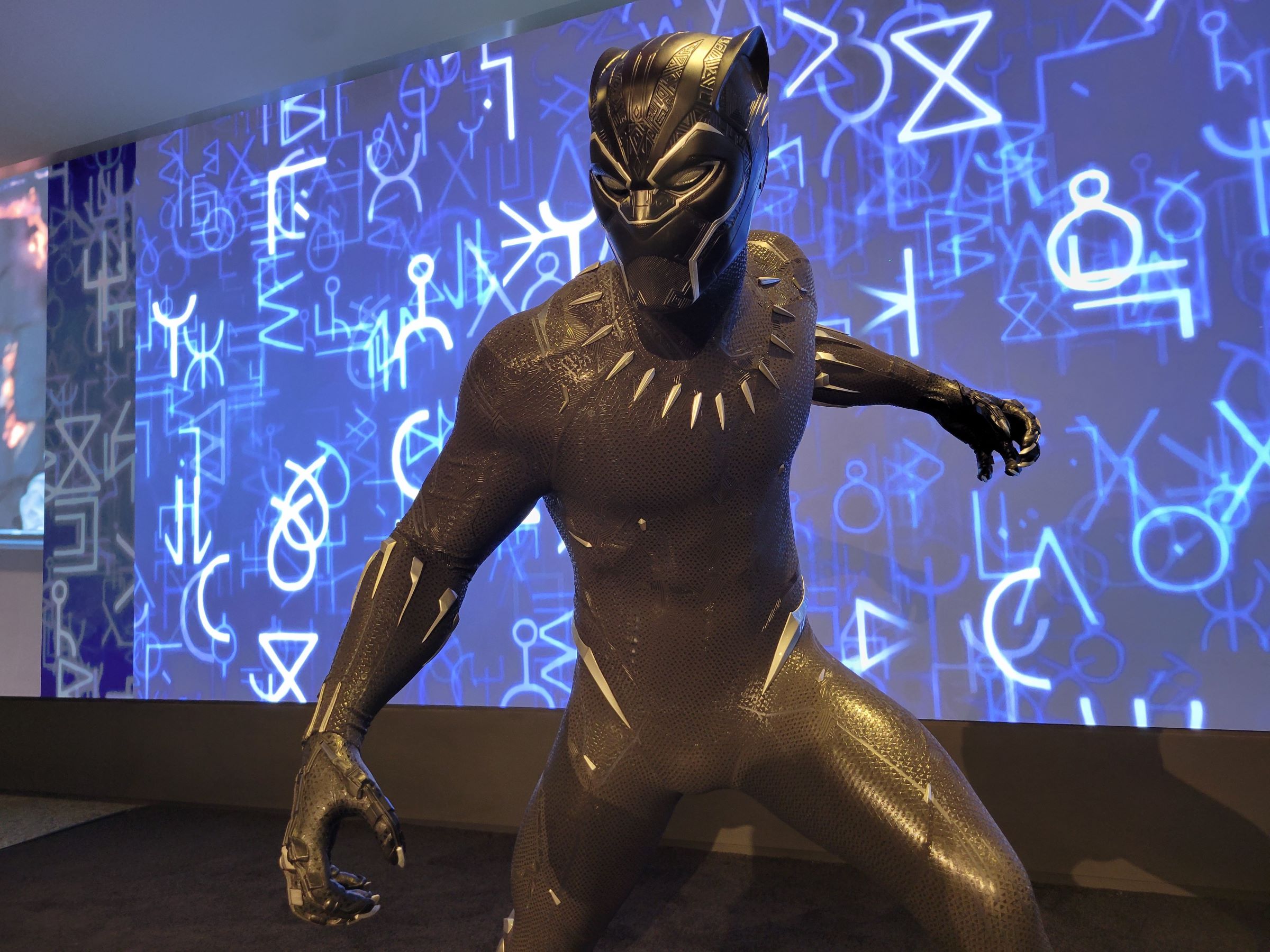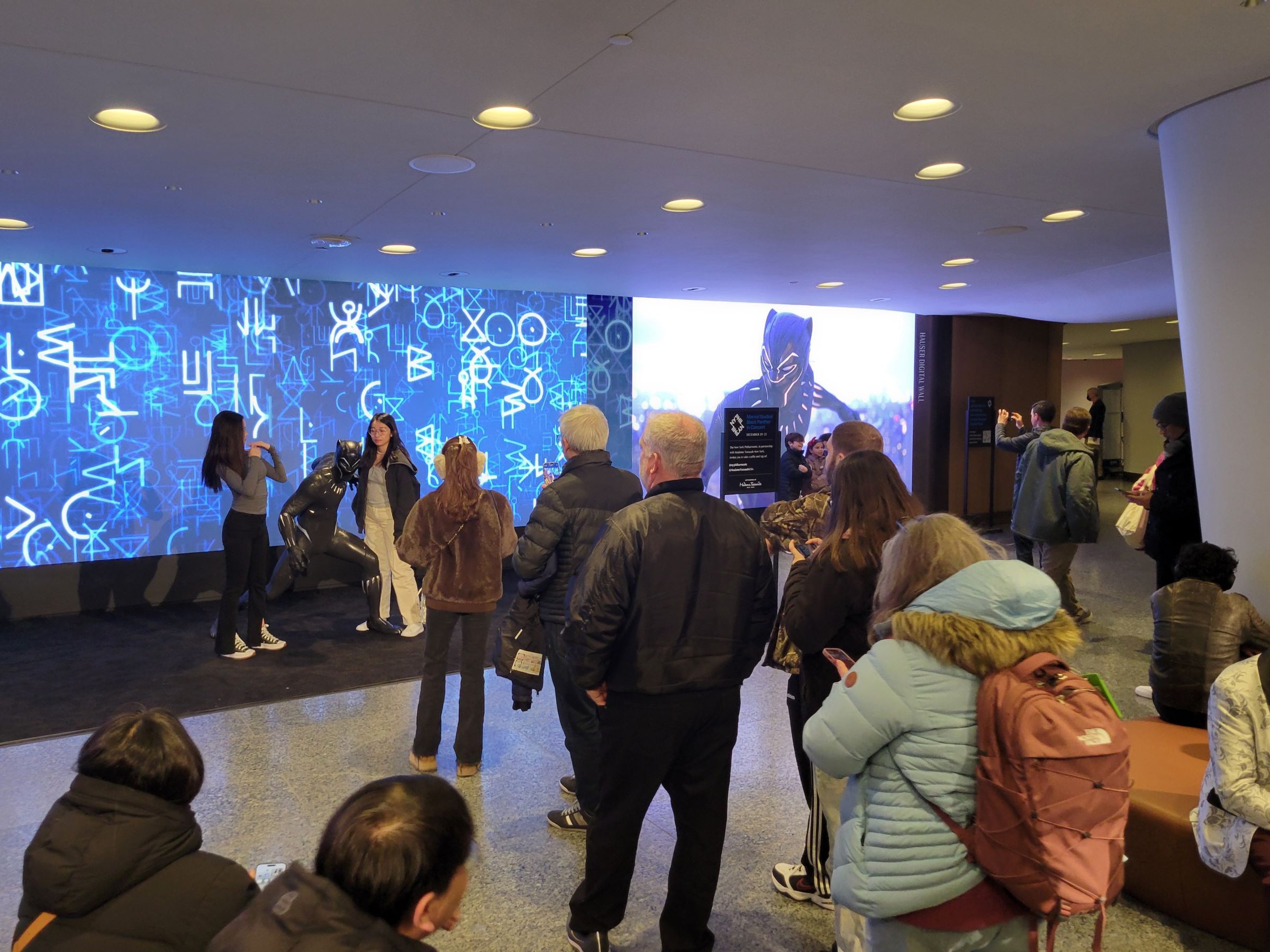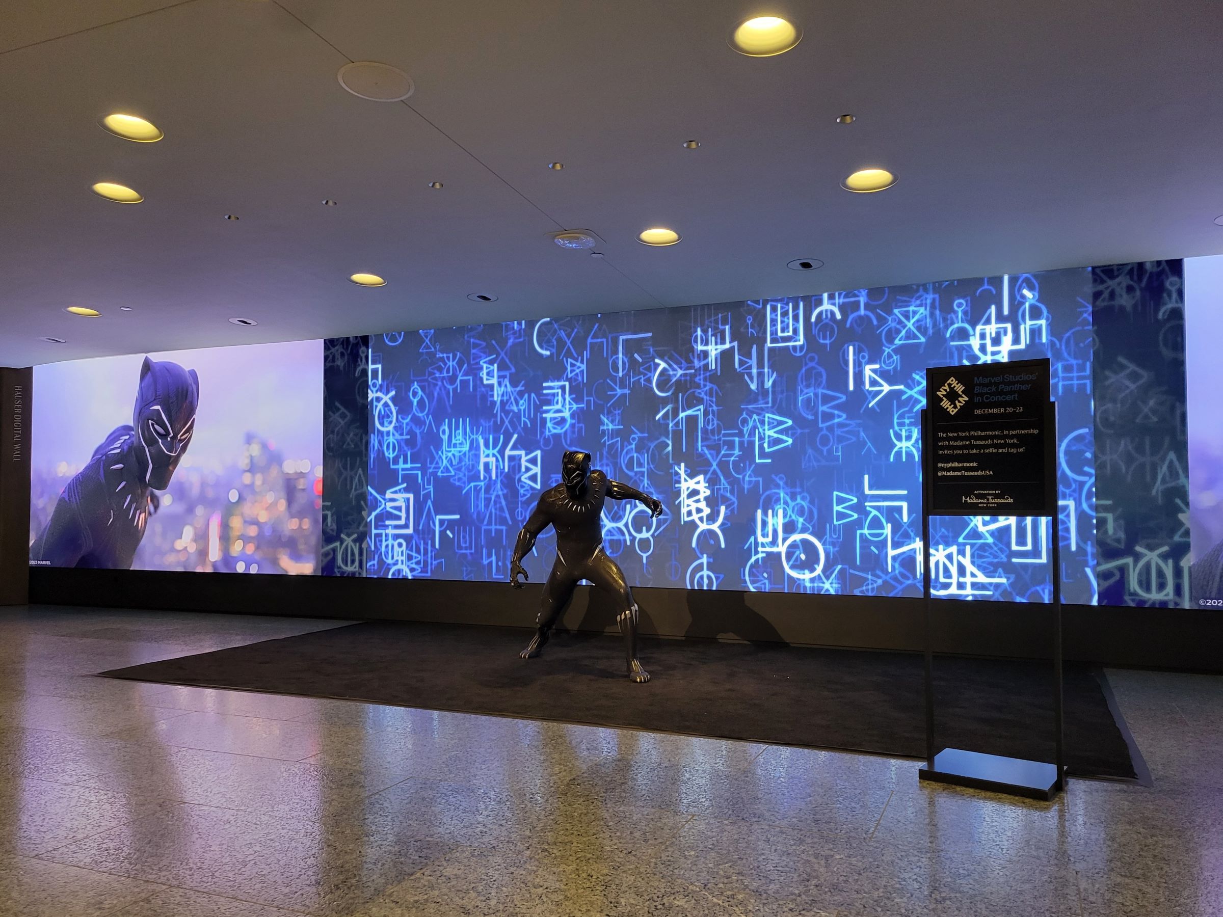 게펜홀의 실내 로비에 자리잡고 있는 것은 바로 블랙팬서(Black Panther)! 인형의 바로 뒤쪽 스크린에는 영화에도 나왔던 와칸다 글자들이 움직이고 있고, 좌우로는 뉴욕 맨하탄의 스카이라인을 배경으로 블랙팬서가 서있는 모습이 나오고 있다.