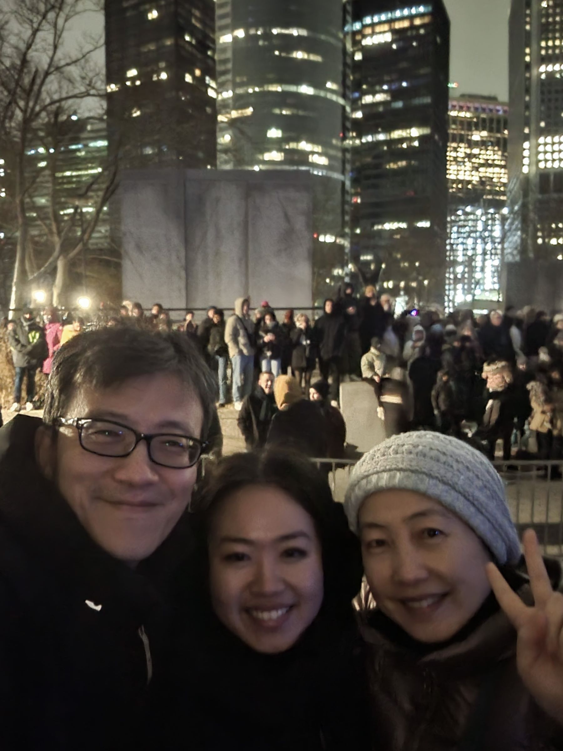 2024년 첫번째 가족 셀카는 맨하탄 다운타운 빌딩들을 배경으로 찍었다. 불꽃이 딱 기둥에 가려 잘 보이지도 않고, 앞쪽 구역이라서 행사가 끝난 후에는 빠져나가기가 힘들 듯 해서, 일단 뒤쪽으로 자리를 옮겨서 계속 보기로 하고 이동을 했다.