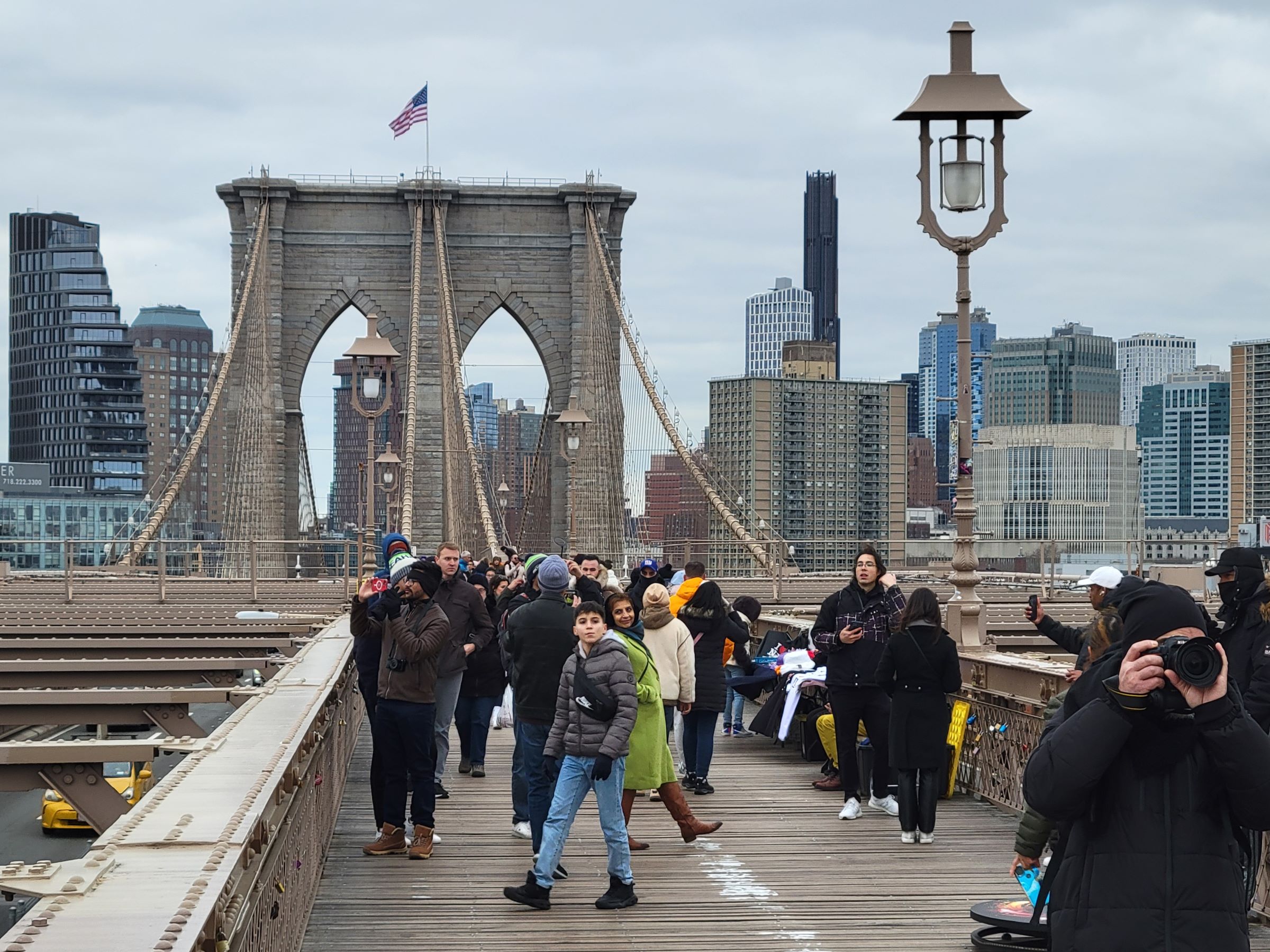 맨하탄의 가장 남쪽 구역인 파이낸셜 디스트릭트(Financial District)의 고층 건물들을 배경으로 브루클린 다리((Brooklyn Br) 교통 표지판이 보인다. 2022년에 차를 몰고 지나간 적은 있었는데, 트럭이나 버스는 다닐 수 없는 그 역사적인 다리를 이제 가족 3명이 함께 걸어보려고 한다.