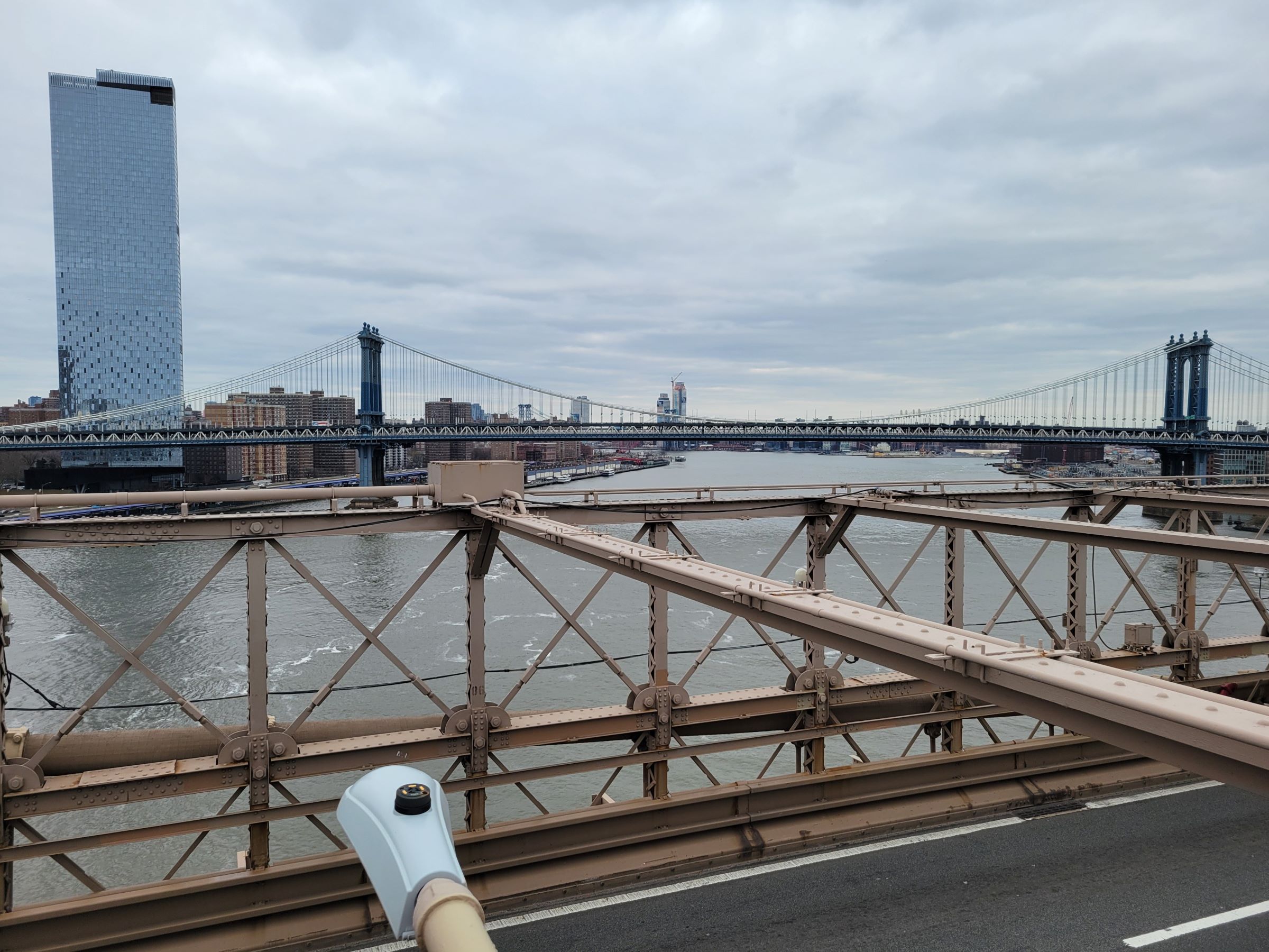 그래도 예의상 다리의 가운데까지 걸어와서 강 건너 브루클린 쪽에 세워져 있는 두번째 타워를 핸드폰 줌으로 당겨서 찍어봤다. (구글맵으로 위치를 보시려면 클릭)