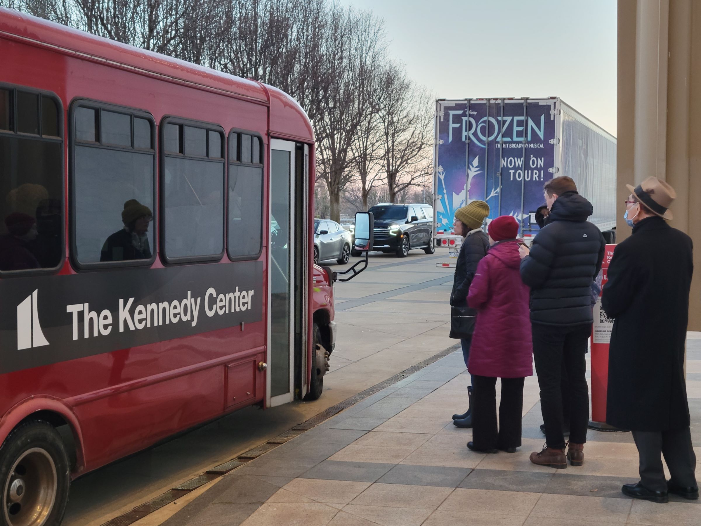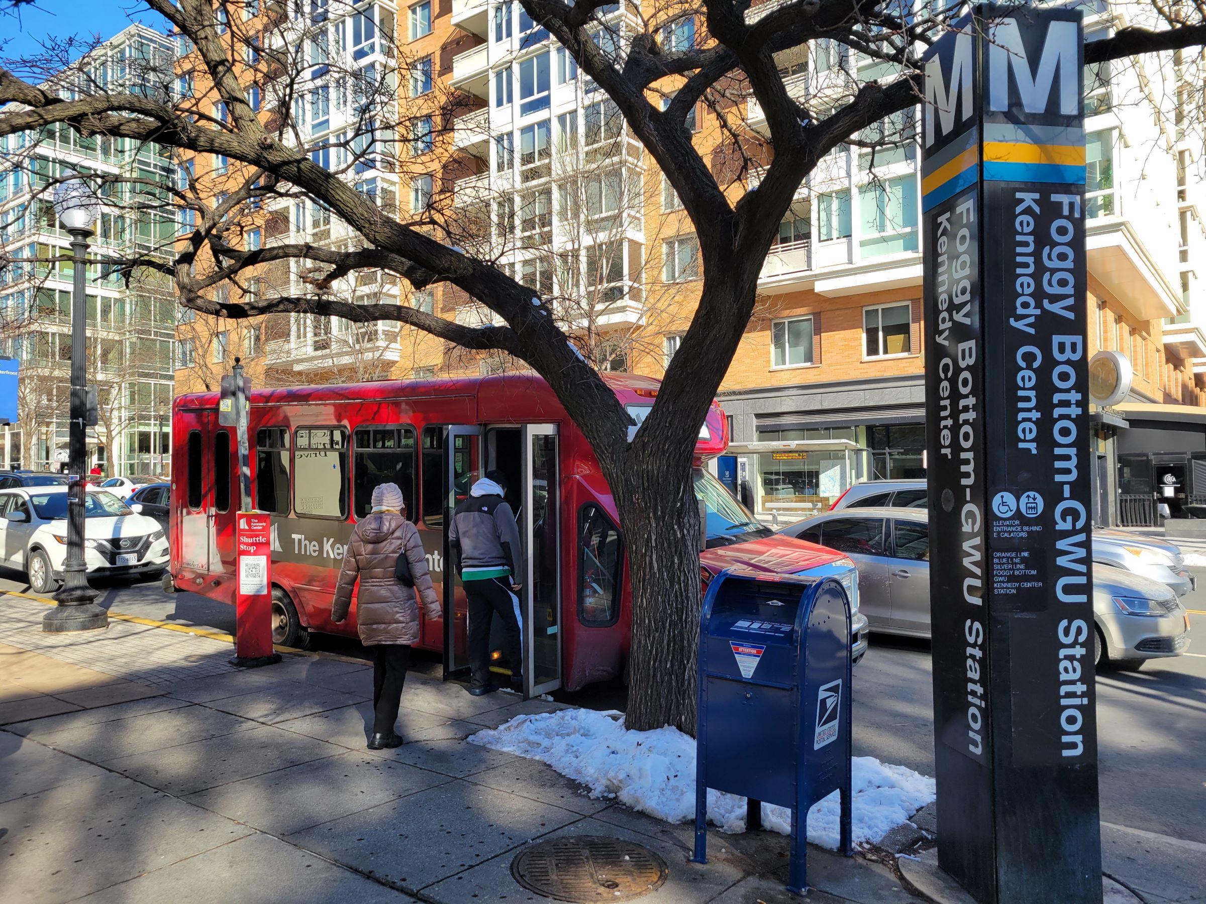 실버라인을 타고 와서 '안개낀 바닥' 포기바텀(Foggy Bottom) 역에서 밖으로 나오니, 빨간 케네디센터 셔틀버스가 딱 우리를 기다리고 있었다. (이 역과 George Washington University에 대해서는 여기를 클릭해서 직전 연주회 포스팅을 보시면 됨)