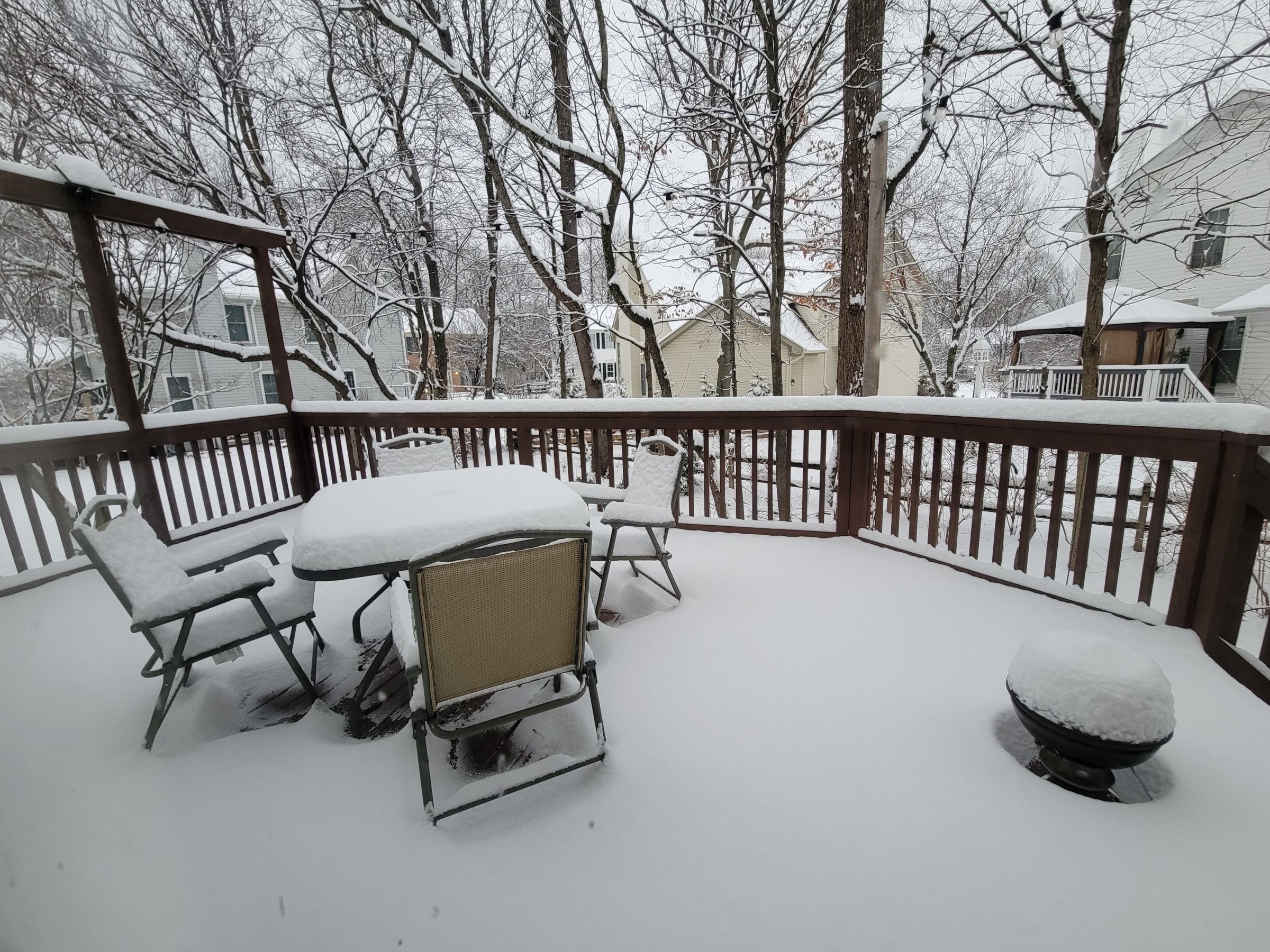화요일 아침의 발코니 모습으로 눈이 4인치 이상은 내린 듯 했다. 문제는 계속 낮기온도 영하라서 하나도 안 녹는다는 것...