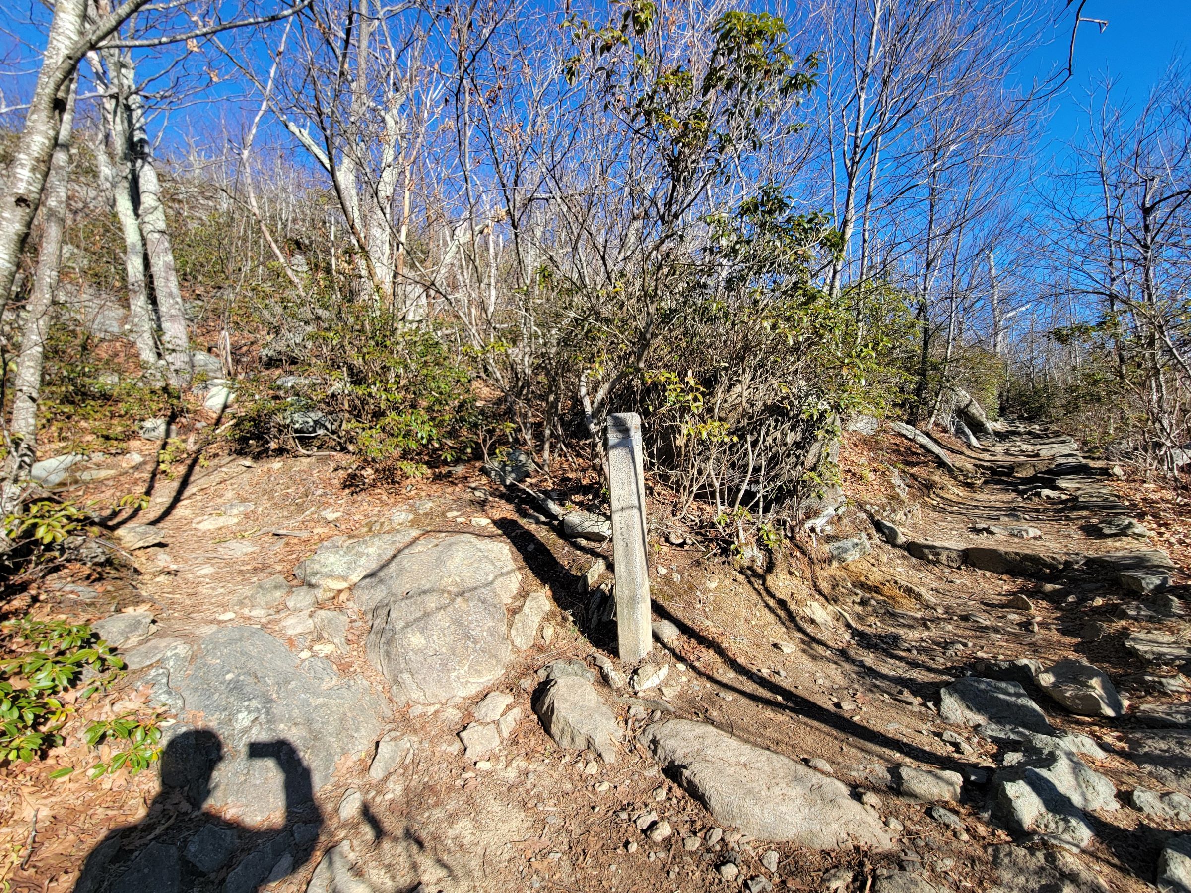 애팔래치안 트레일 이정표인 사각의 콘크리트 기둥이 세워진 주능선의 삼거리에 도착했다. AT는 여기서 왼편으로 산맥을 따라 계속 남쪽으로 이어지고, 이 날의 목적지는 오른편으로 조금만 더 걸어가면 나온다.