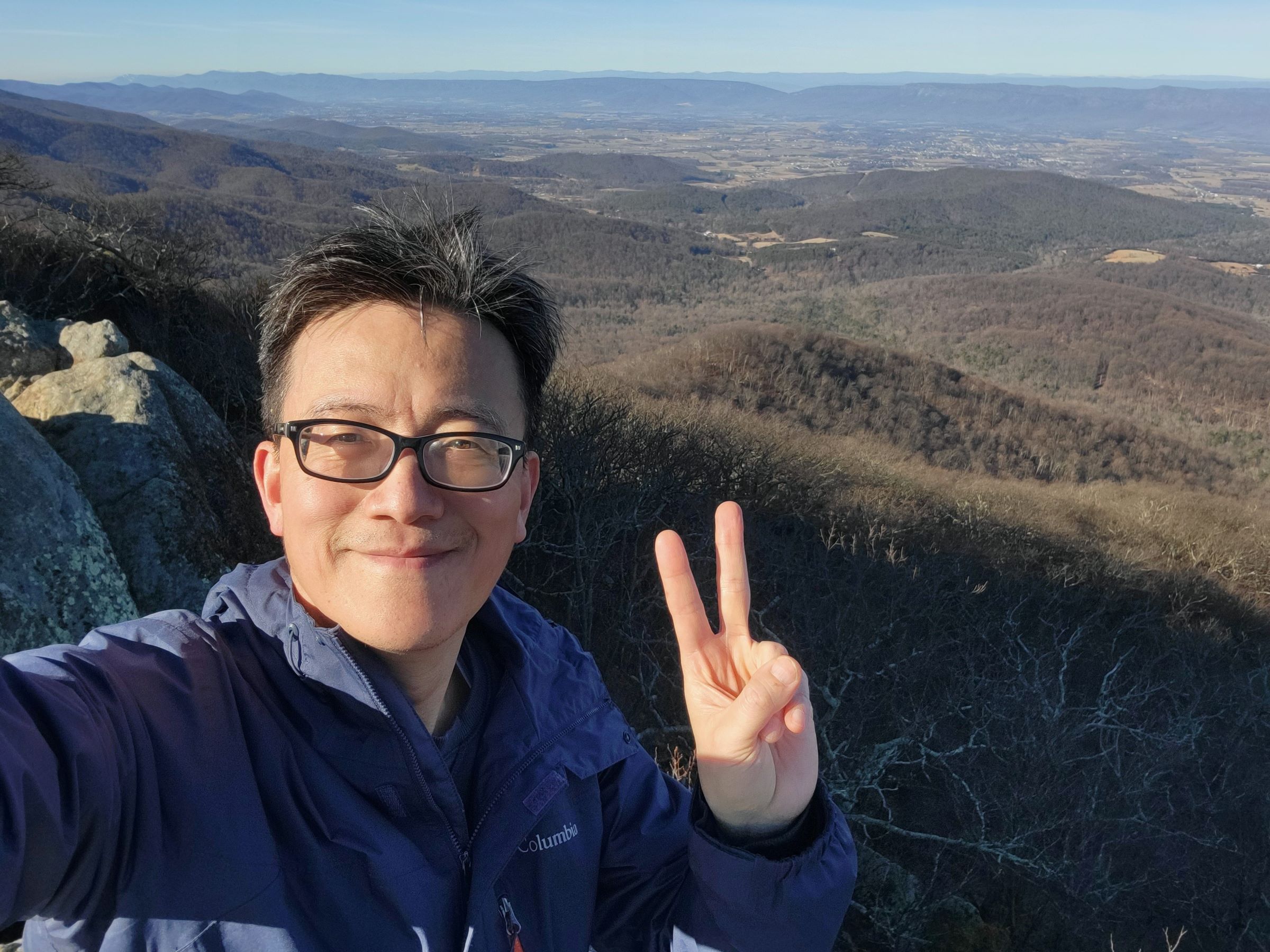 쉐난도어 국립공원을 이루는 블루리지 산맥(Blue Ridge Mountains)의 서쪽 아래 페이지 밸리(Page Valley)를 배경으로, 정말 오래간만에 꺼낸 등산복을 입고 셀카 한 장 찍었다. (구글맵으로 위치를 보시려면 클릭)