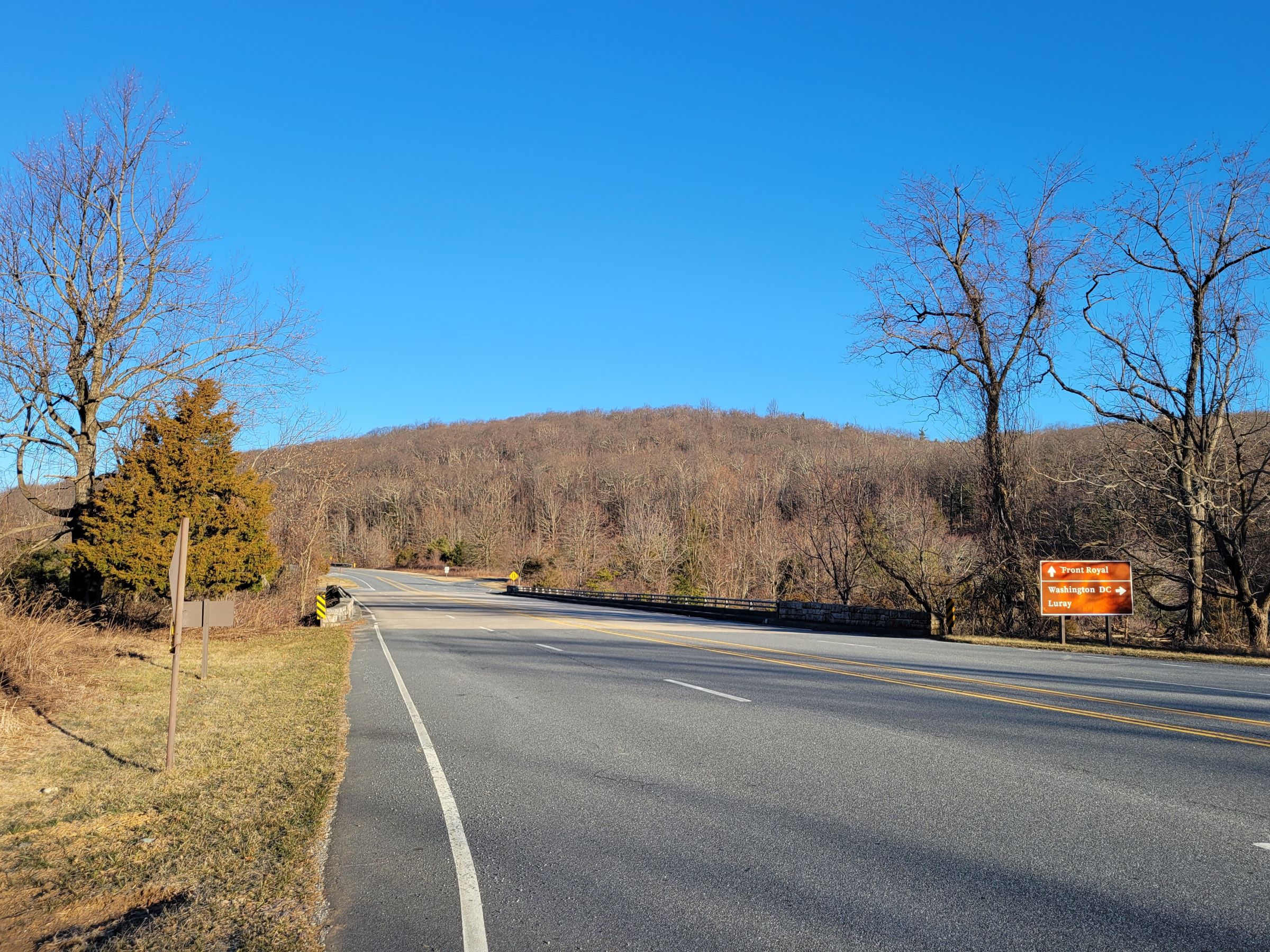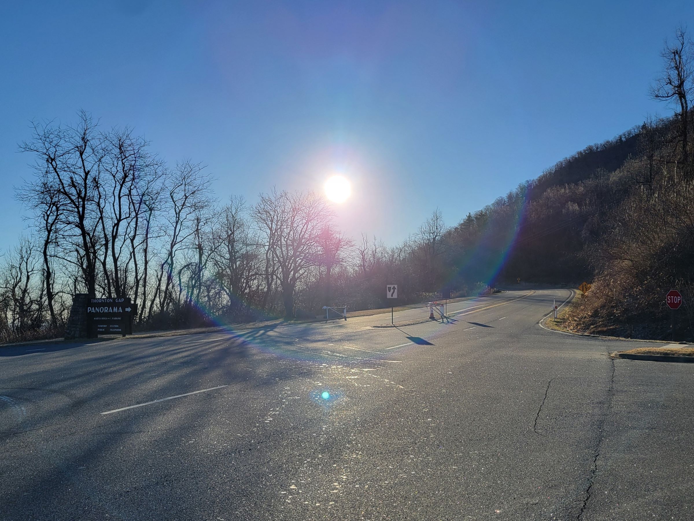 겨울해가 이미 높이 떠오른 남동쪽 방향으로 바라본 스카이라인 드라이브(Skyline Dr) 도로의 모습으로, 여기 파노라마(Panorama) 주차장의 입구를 알려주는 표지판이 보인다.