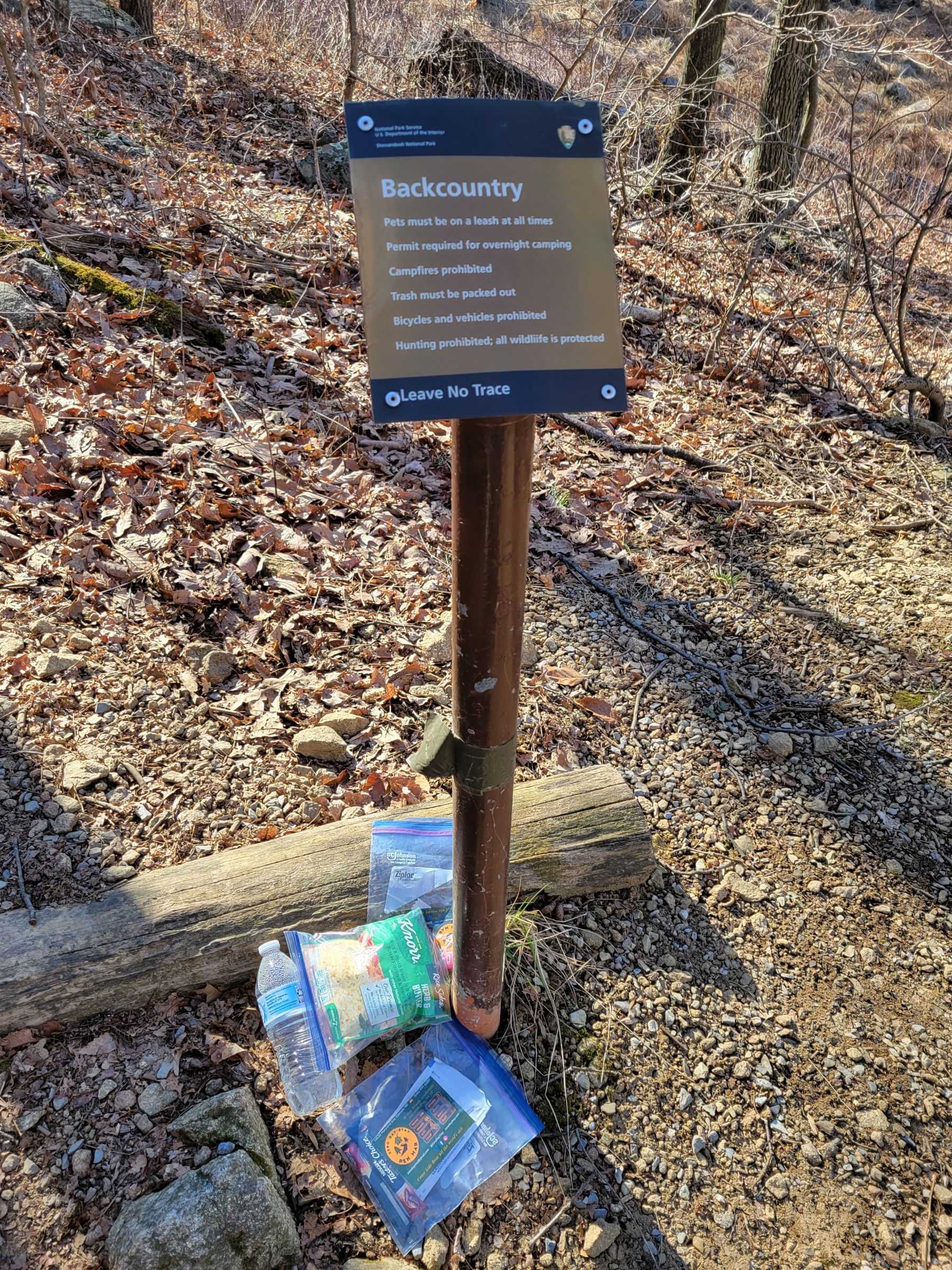 출발 직후에 애팔래치안 트레일(Appalachian Trail, AT)과 만나는 삼거리에 세워진 백컨트리(Backcountry) 안내판 아래에는, 여기서 아웃하는 백패커가 고이 지퍼락에 넣어서 필요한 사람은 가져가라는 듯이 놓아둔 물품들이 몇 개 있어서, 옛날 JMT의 추억을 떠올리게 했다... "내가 커다란 배낭을 메고 백패킹을 할 기회가 다시 올까?"