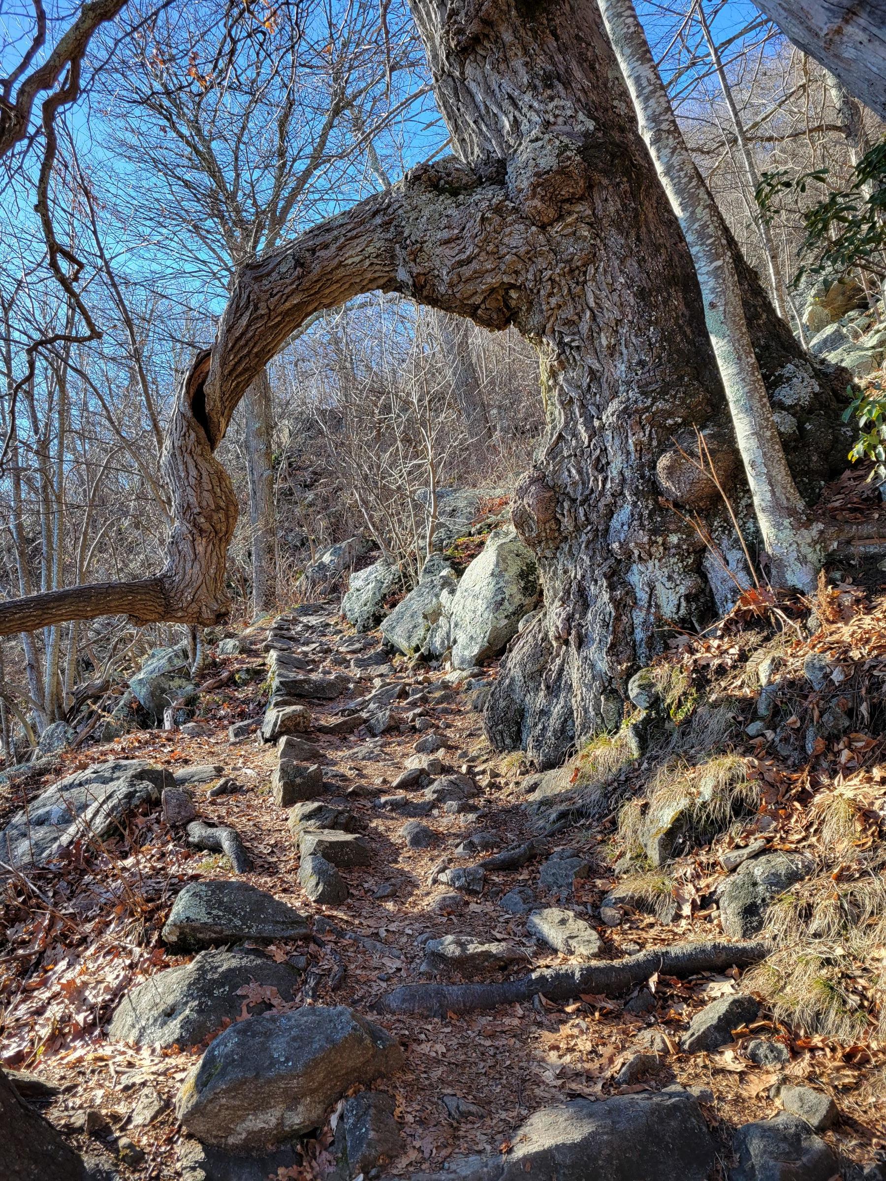 앞서 트레일헤드 안내판의 흑백사진 아래에도 설명이 있었지만, 이 구간은 옛날 1930년대 CCC들이 돌로 축대를 정말 잘 쌓아서 등산로를 필요 이상으로 걷기 편하게 만들어 놓았다는 생각이 계속 들었다. 그리고 마치 일부러 휘어지게 만든 것 같은 저 나뭇가지는... 옛날 10여년 전에 올랐던 '천사가 내려앉는 곳'의 마지막 입구를 지키고 있던 나무를 떠올리게 했다.