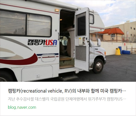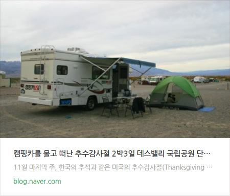 LA에서 미국여행 블로거로 한창 주가를 올리고 있었던 위기주부가 캠핑카USA의 협찬을 받아서, 추수감사절 연휴에 이웃 가족들과 함께 데스밸리 국립공원으로 떠났던 2박3일 여행기 4편을 클릭해서 차례로 보실 수 있다. 이 때가 미국 이민 후에 가장 즐겁고 특별한 기억으로 계속 남아있는 이유는... 5가족 17명의 단체 자동차캠핑을 이끌었던게 첫번째지만, 처음으로 경험했던 캠핑카에 대한 기억도 뇌리에 남았기 때문이리라~^^
