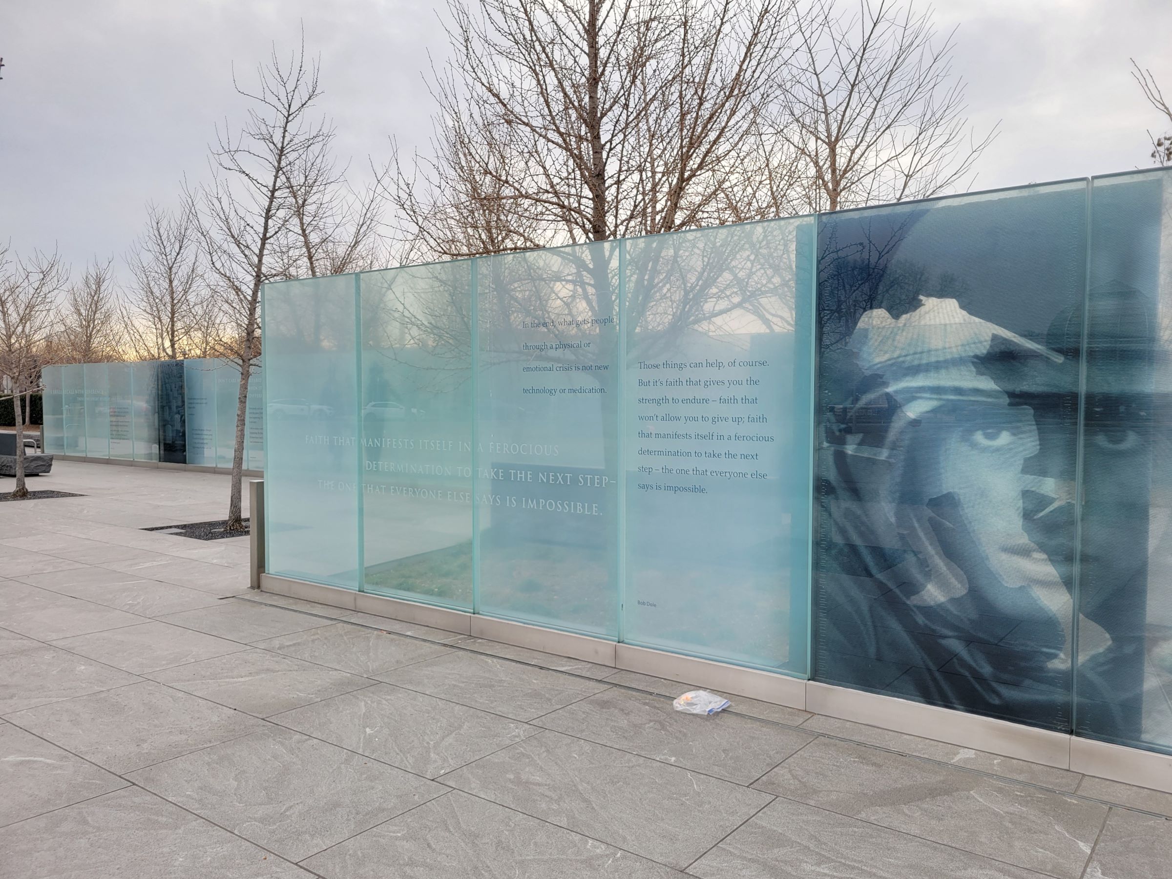 안쪽으로 들어서면 군복무 중에 교전이나 사고로 불구가 된 상이용사들의 이야기가 5겹으로 세워진 강화유리에 새겨져 있고, 유리 뒤쪽으로는 실루엣이 그려진 4개의 청동판 조각도 겹쳐있다. 지금은 앙상한 가지만 보이는 은행나무들은 매년 11월 11일인 '참전용사의 날' 베테랑스데이(Veterans Day) 전후로 노랗게 물든단다.
