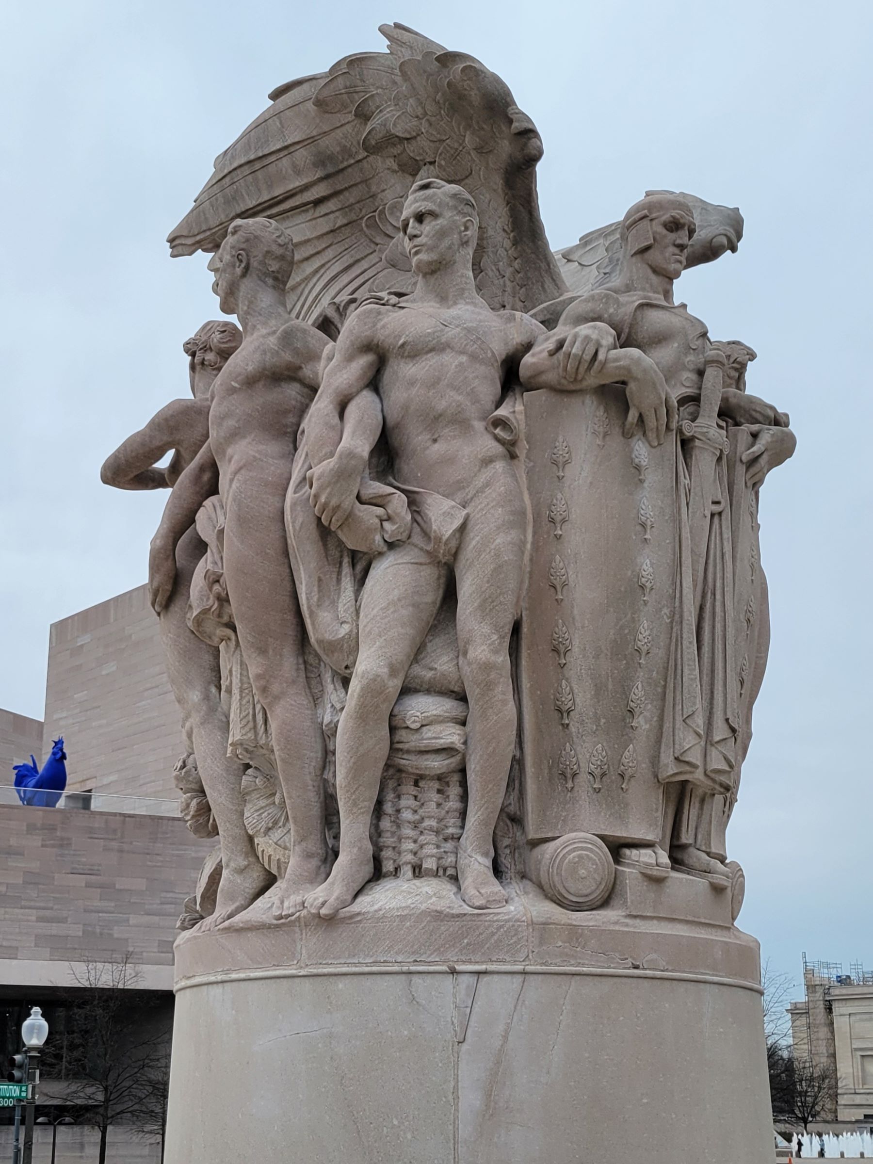 제일 먼저 시야에 들어오는 것은 현대미술 전시관인 내셔널갤러리 동관인데, 처음 보는 왼편의 커다랗고 하얀 야외조각은 미국인 조각가 프랭크 스텔라(Frank Stella)의 작품이란다. 내부 전시와 함께 오른편 '파란 닭'이 있는 옥상에서 이 쪽을 내려다 본 모습은 여기를 클릭해서 보실 수 있고, 이제 저 건물의 바로 북쪽에 있는 다른 동상들을 또 찾아 3rd St 횡단보도를 건넌다.