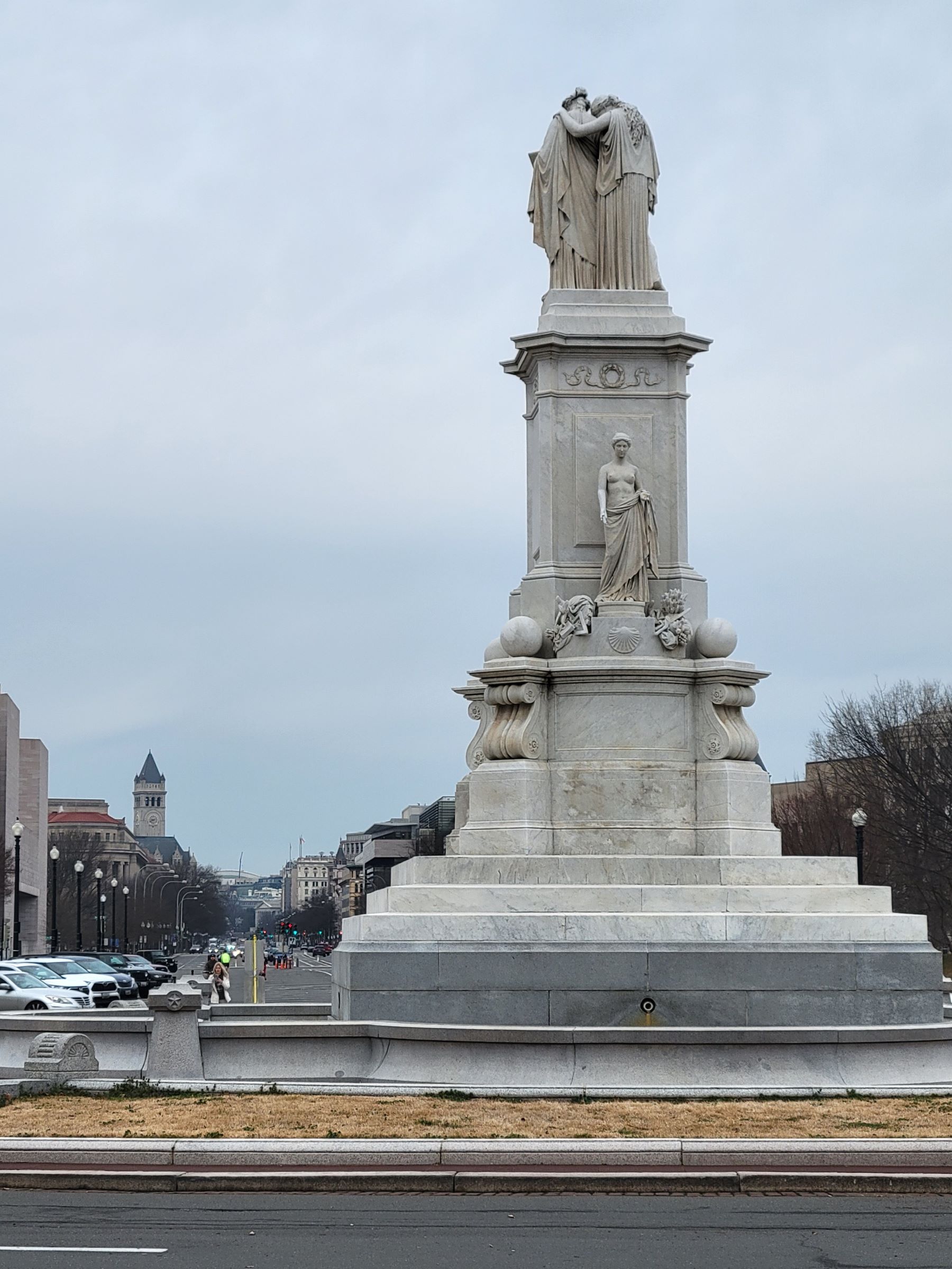 북서쪽으로 백악관까지 이어져서 도로 자체가 하나의 국립사적지인 Pennsylvania Ave 설명은 멀리 왼편에 보이는 시계탑에 올랐던 여행기를 클릭해서 보시면 된다. 여기 시작점에는 높이 44피트의 하얀 대리석 조각인 평화 기념비(Peace Monument)가 세워져 있는데, 의사당을 향하는 뒷면의 여성은 '평화(Peace)'를 상징한다.