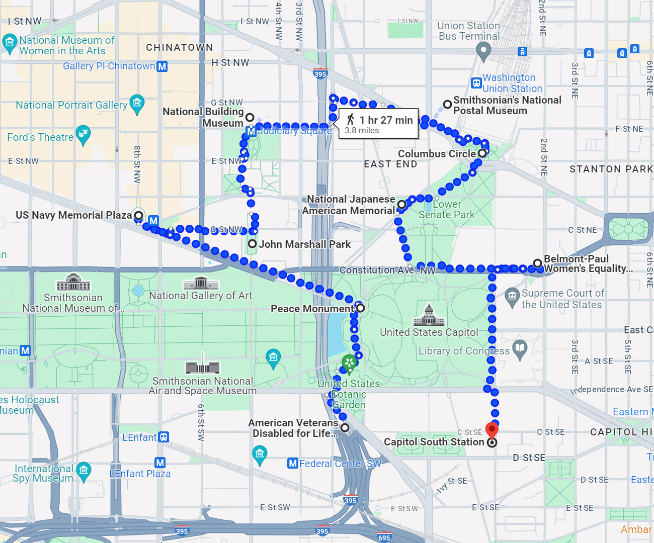 오랫동안 계획을 세워서 마침내 실행에 옮긴 하이킹 코스로, 가운데 아래쪽 Federal Center SW 역에서 시작해 시계방향으로 의사당을 감싸고 돌아 Capitol South Station까지 약 4마일이다. 물론 1시간반 동안 걷기만 하는 것은 아니고, 경로상의 여러 기념물, 동상, 박물관 등을 구경하는게 주목적이었는데, 그 갯수가 20개가 넘어서 5~6편으로 나누어 차례로 소개하는 시리즈의 1탄이다. 참고로 그 장소들 중에서 아내가 관심있어 할 곳은 스미소니언 박물관 하나 뿐이라서, 거기는 언제든지 모시고 다시 방문할 생각이다.^^