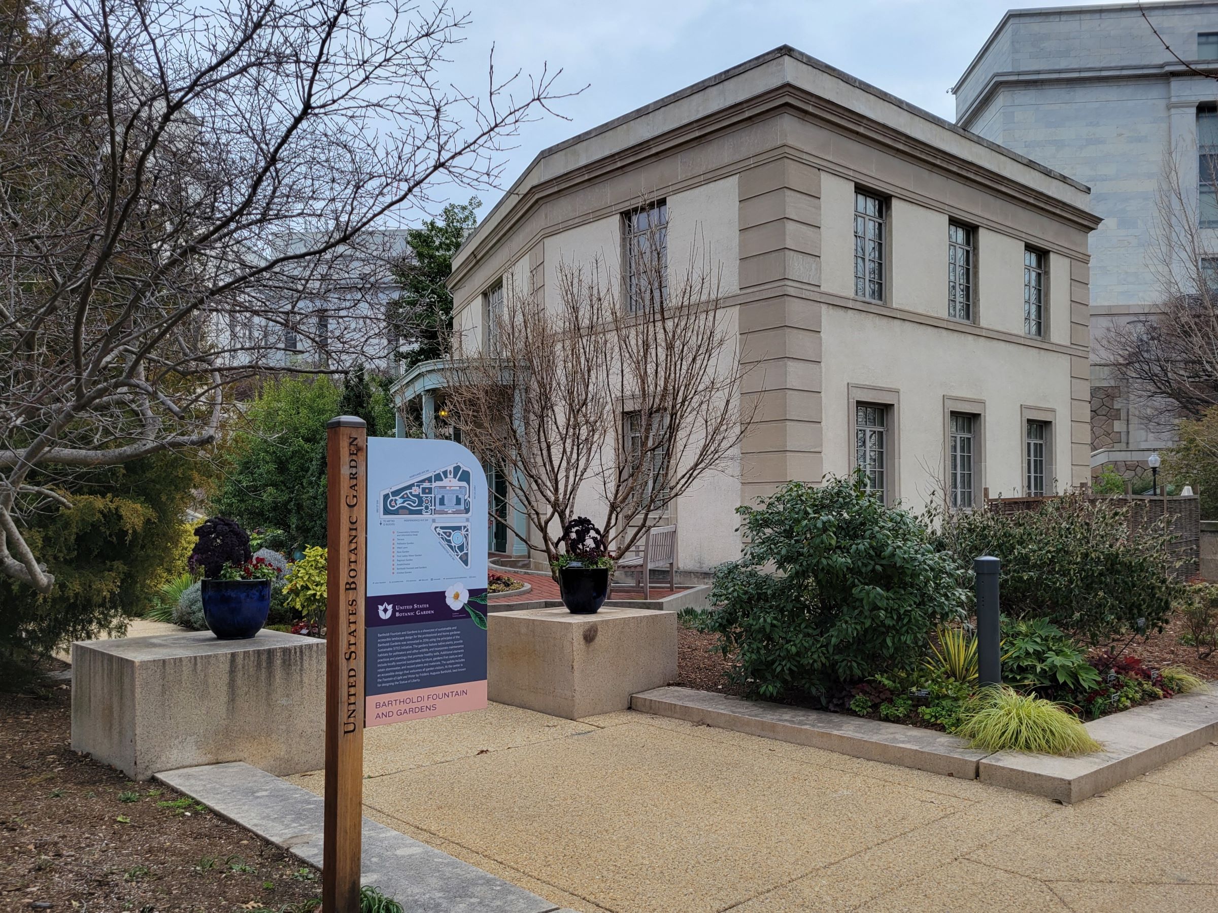 상이군인 기념관에서 대각선의 Washington Ave를 건너면, 안내판에 그려진 국립식물원(US Botanic Garden) 지도의 남쪽 역삼각형 부분인 바르톨디 분수정원(Bartholdi Fountain and Gardens)이 나오는데, 뉴욕 자유의 여신상을 제작한 프랑스의 조각가 Frédéric Bartholdi 이름에서 따왔다. 사진 가운데의 2층 건물은 식물원 관리소였지만 이른 시간이라 문을 열지 않았었다.