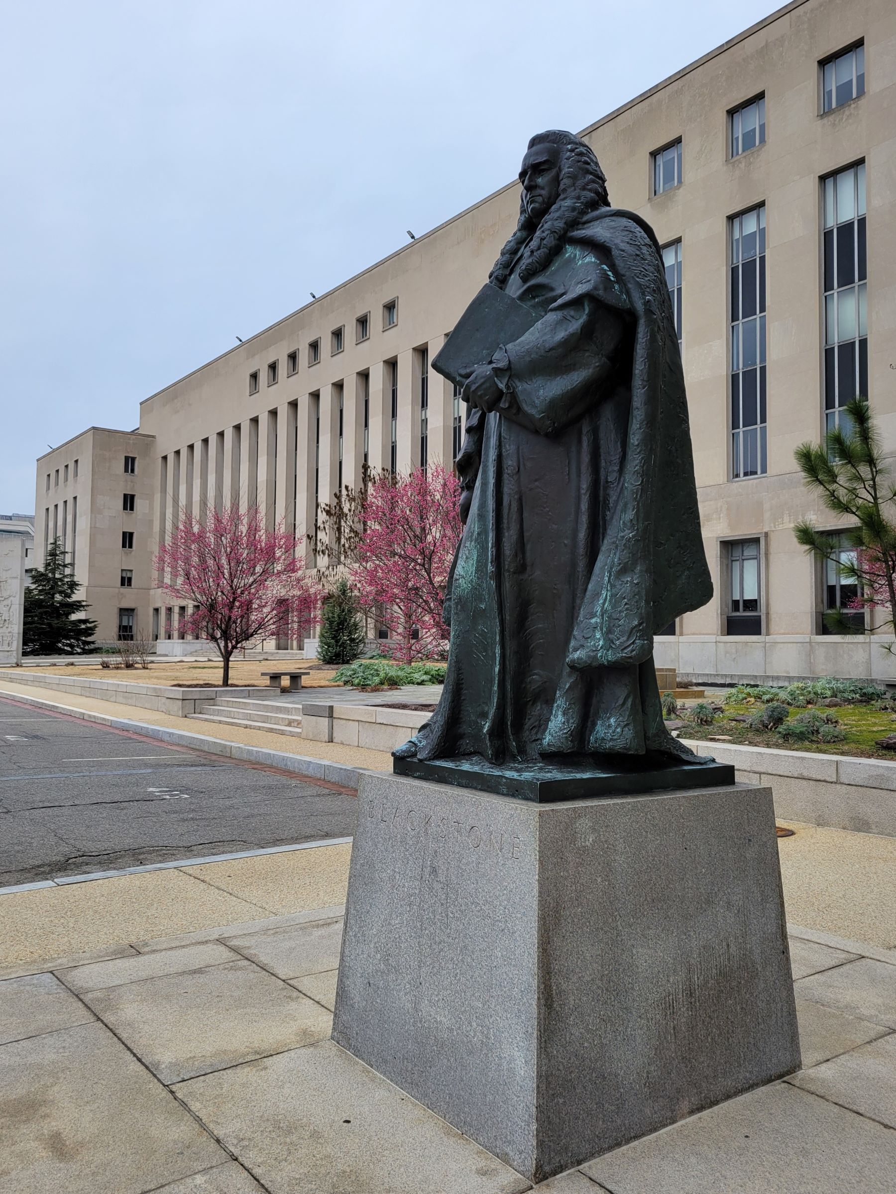 미드 기념물의 배경이던 건물은 연방법원으로 여기서 북쪽으로 3rd St와 6th St 사이에는 많은 법원과 경찰서 등이 모여있는데, 시리즈 2탄에서 자세히 소개될 예정이다. 그 구석에 이 동네에 어울리지 않는 헤어스타일과 의상을 입은 분이 계신데, 기단에 블랙스톤이라 되어 있지만, 같은 이름의 세계 최대 사모펀드와는 관계가 없고... 18세기 영국의 법학자인 Sir William Blackstone으로 당시 영국법 전반을 체계화하고 해설한 그의 저서가 독립전쟁 전후의 미국법 발달에 큰 영향을 주었기 때문에 1943년에 이 자리로 옮겨왔단다.