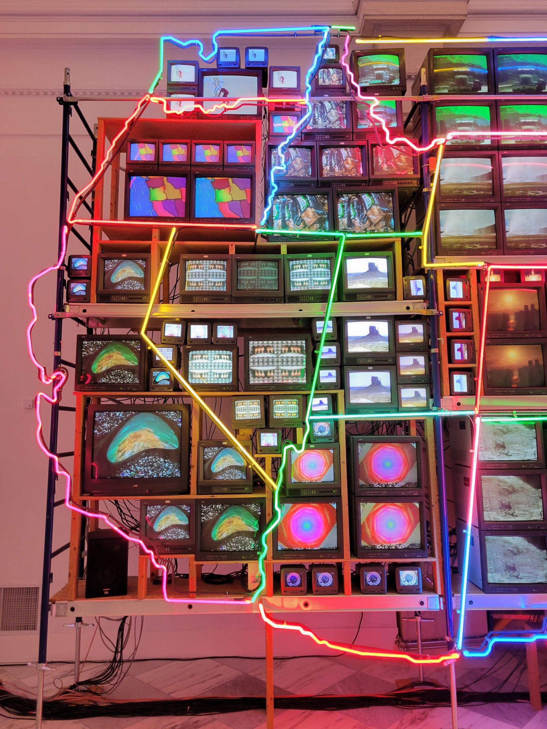 누가 공돌이 아니랄까봐 배선과 전원공급이 궁금했는데, 작품의 뒷쪽도 이렇게 옆에서 대강 볼 수가 있었다. 수 많은 멀티탭들은 6개 콘센트 꽉꽉 채워서 전원 플러그와 어댑터들이 꽂혀 있었고, 나무로 만든 기본구조는 다시 철제 구조물로 튼튼히 고정된 것 같았다. 바닥을 따라 뒤쪽까지 불이 들어와 있는 네온사인은 텍사스의 남쪽 경계를 구부린 것으로, 플로리다 남쪽도 바닥을 따라 구부러져 있었지만 누가 밟았는지 불이 들어오지 않았다. 마지막으로 이 작품은 항상 켜두는 것은 아닐텐데, 매일 끄고 켜는 것은 어떻게 하는지? 또 설마 지금도 VHS 테이프에 녹화된 영상을 틀지는 않을테니 디지털로 어떻게 바꿔서 화면에 내보내는지 등도 궁금했다.
