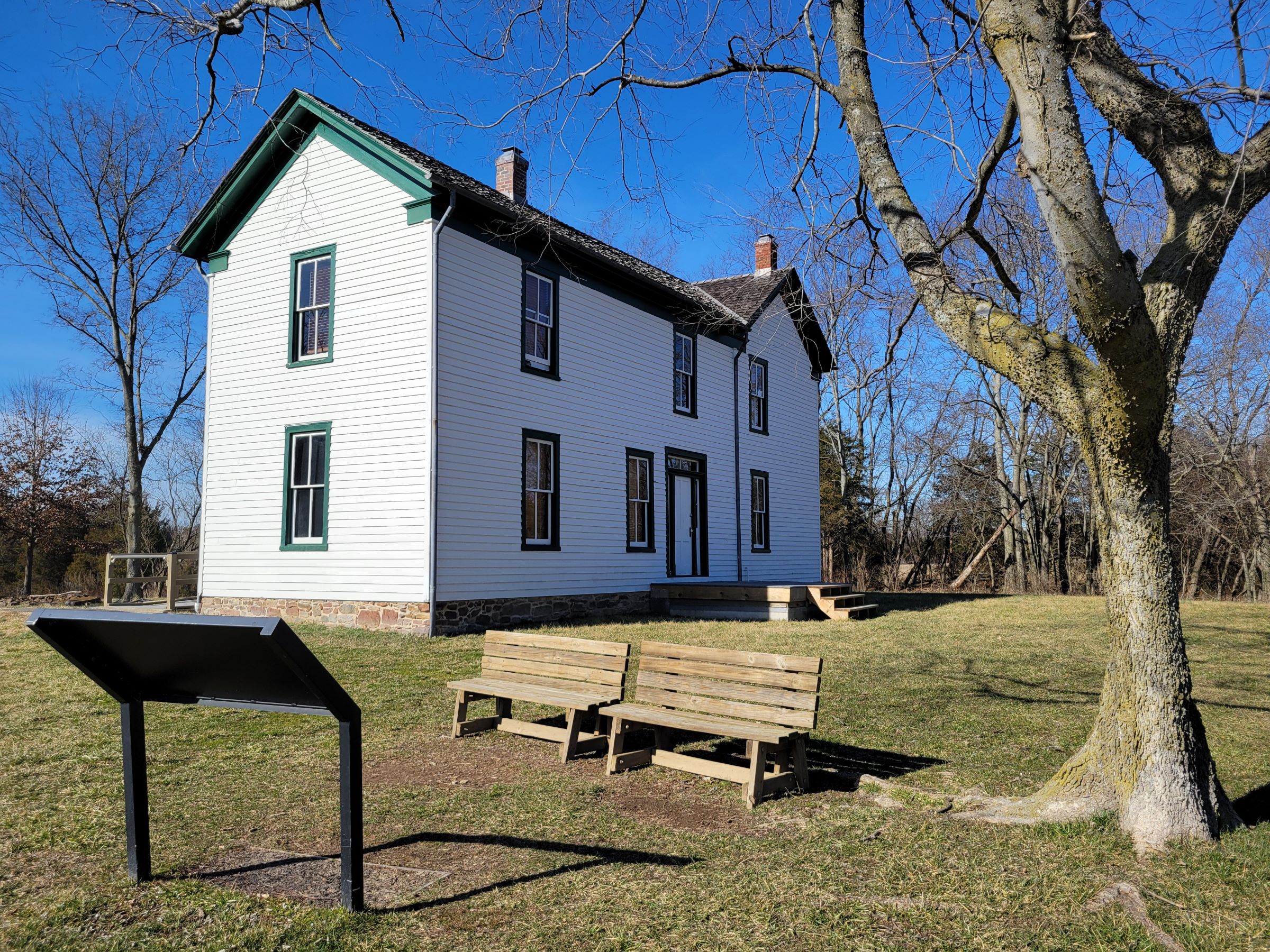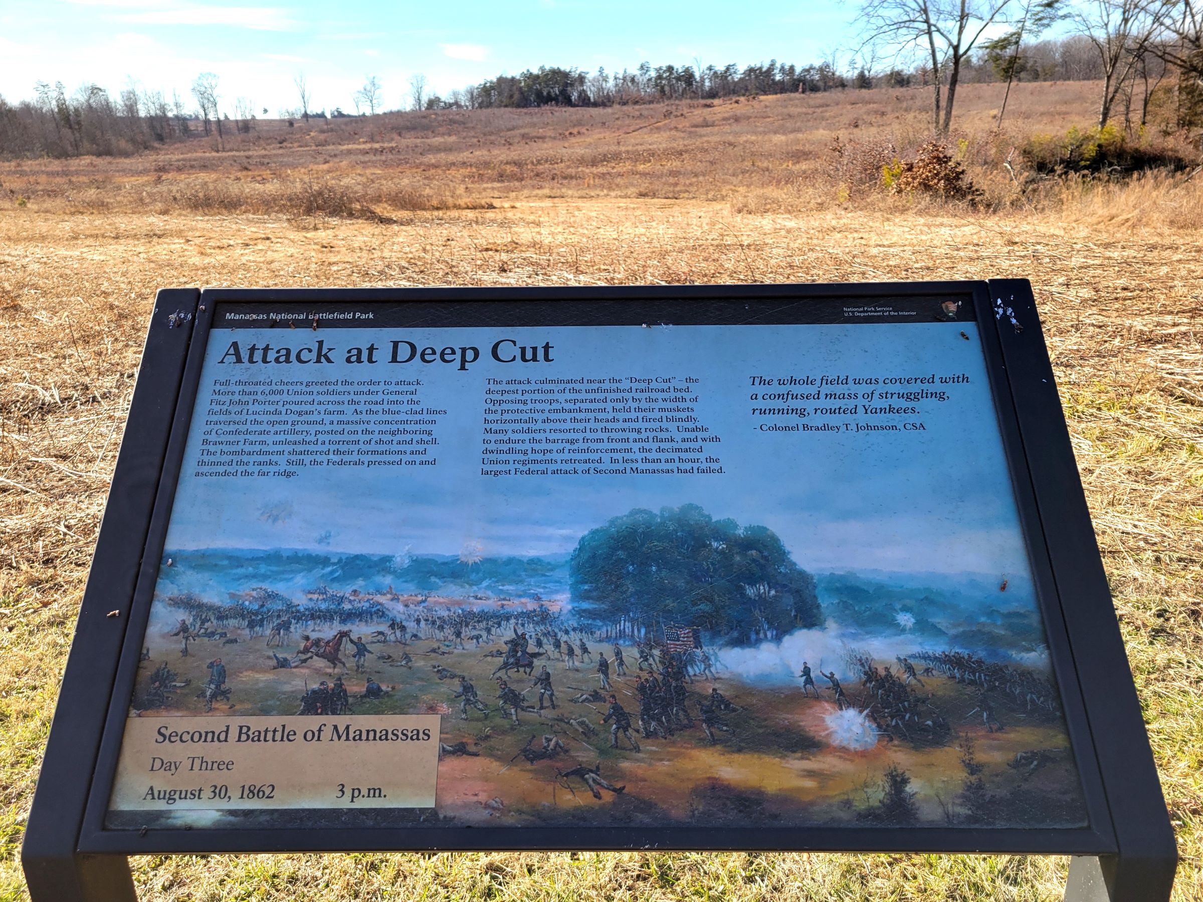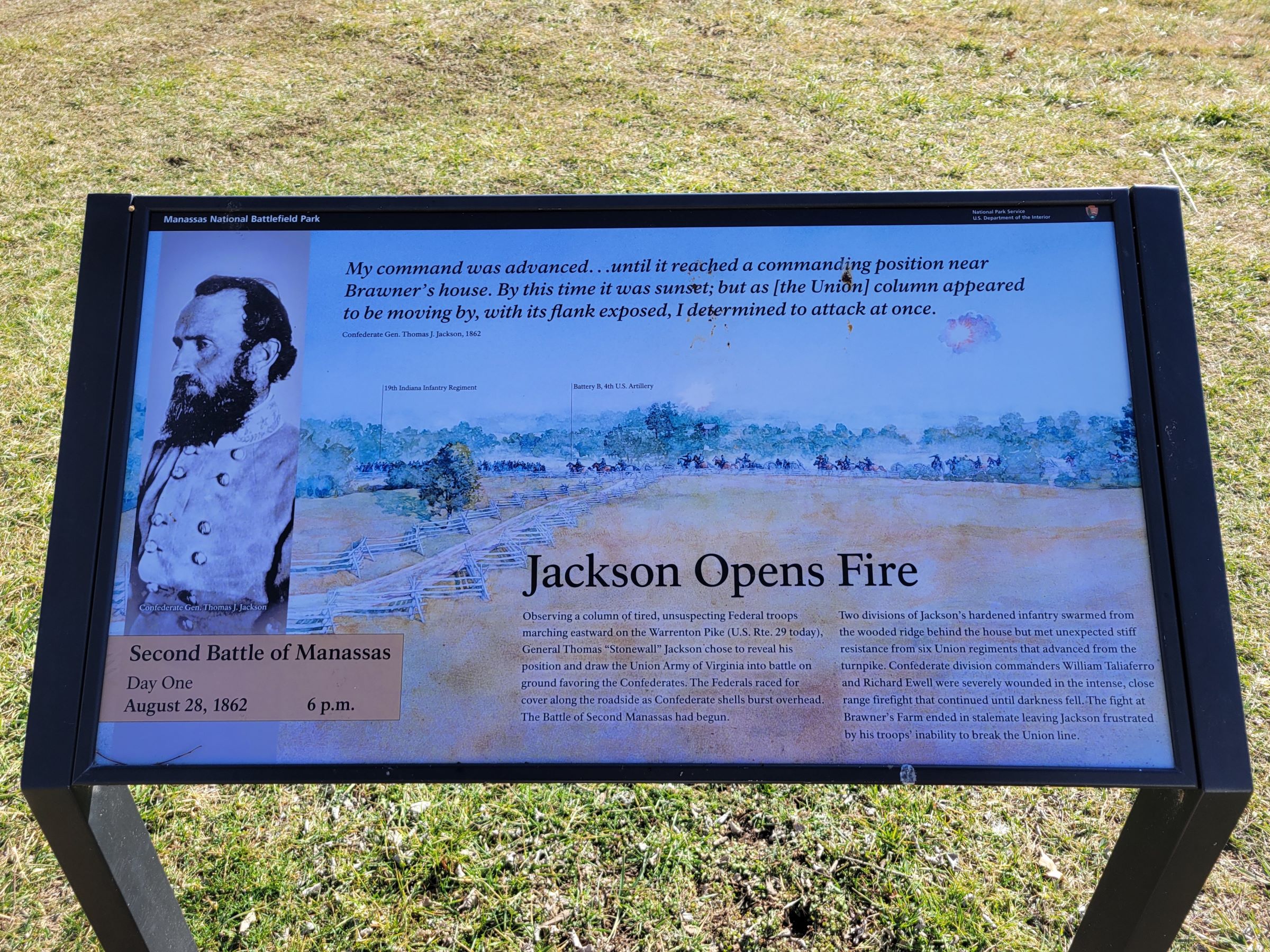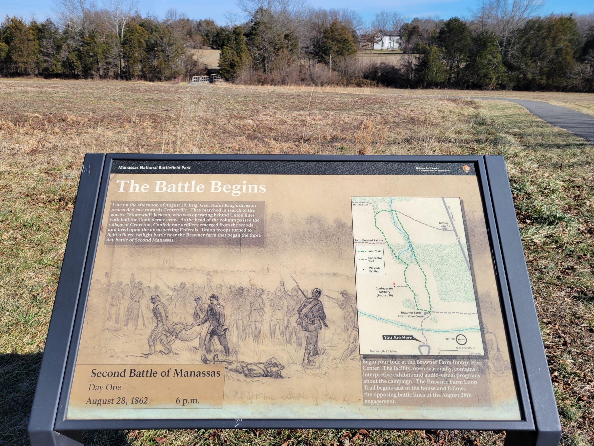 Brawner Farm Interpretive Center는 여름철 주말에만 오픈을 해서 문은 굳게 닫혀 있었는데, 전황판과 병사 마네킹 등이 있는 내부 전시가 궁금하신 분은 여기를 클릭해 왠 로펌에서 올려놓은 유튜브를 보시면 된다. 이 곳에 벤치와 함께 놓여진 저 안내판에는 바로...