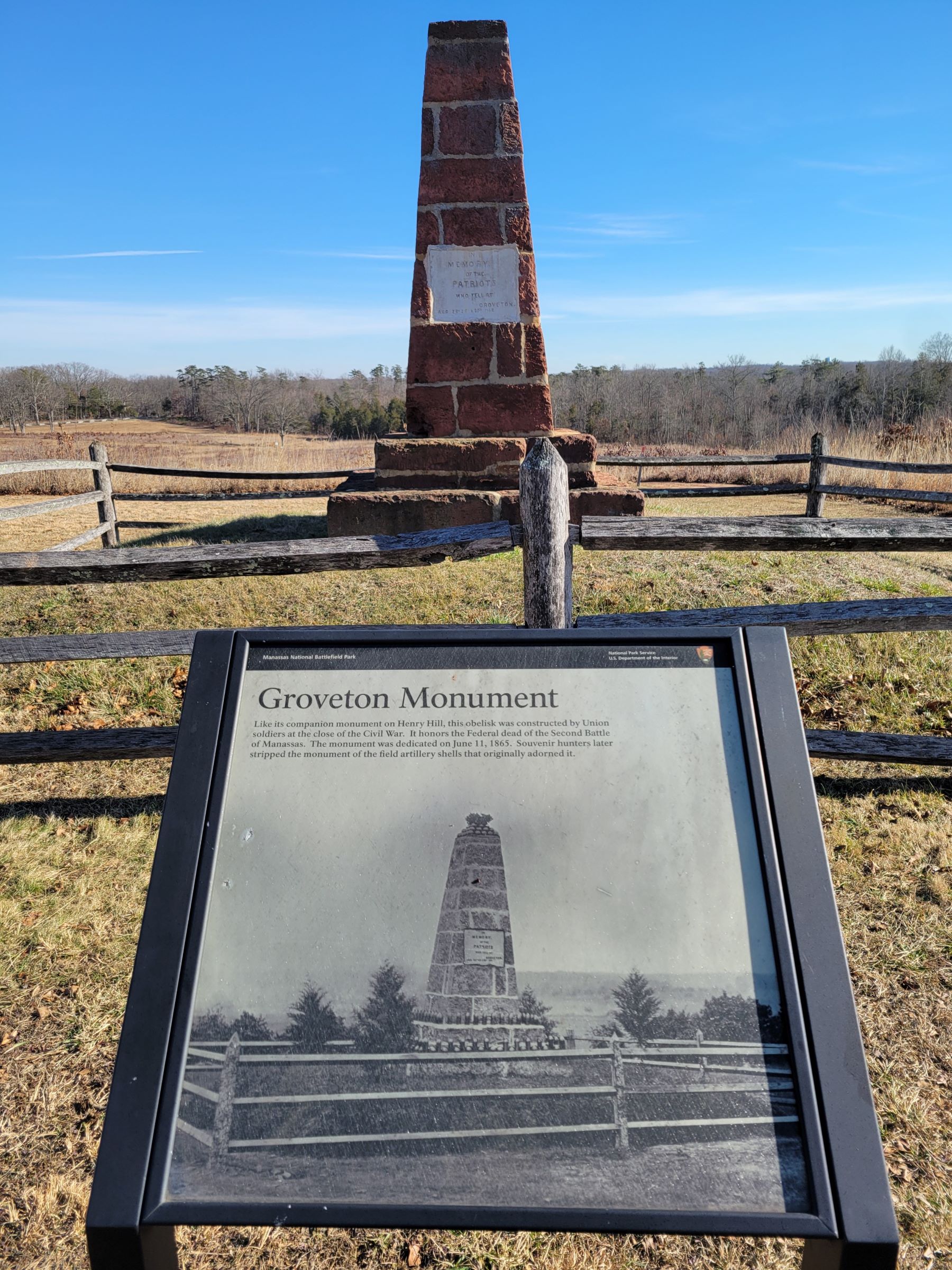 그로브톤 모뉴먼트(Groveton Monument)는 남북전쟁이 끝난 직후에, 헨리힐의 불런 기념비와 함께 같은 모양으로 여기 언덕에 만들어졌다. 처음에는 흑백사진처럼 유해를 수습하면서 나온 포탄들로 장식이 되어 있었는데, 옛날 사람들이 기념품으로 가져가서 지금은 하나도 남아있지 않다고...