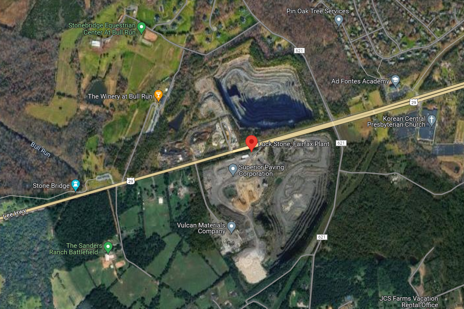첫번째 지도의 제일 동쪽에 ⑫번으로 표시된 Stone Bridge를 지나면 도로 좌우의 땅이 진짜로 깊이 깍인 채석장을 관통하는게 참 신기했는데, 이렇게 지금도 채굴이 되고있는 채석장이 우리 동네 주변으로도 또 있었다. 위성 지도 오른편의 Korean Central Presbyterian Church는 북버지니아에서 가장 크고 유명한 와싱톤중앙장로교회, 여기 사람들이 줄여서 '중장'이라 부르는 한인교회이고, 여기서부터 동쪽으로 나오는 마을이 신흥 코리아타운인 센터빌(Centreville)이다.
