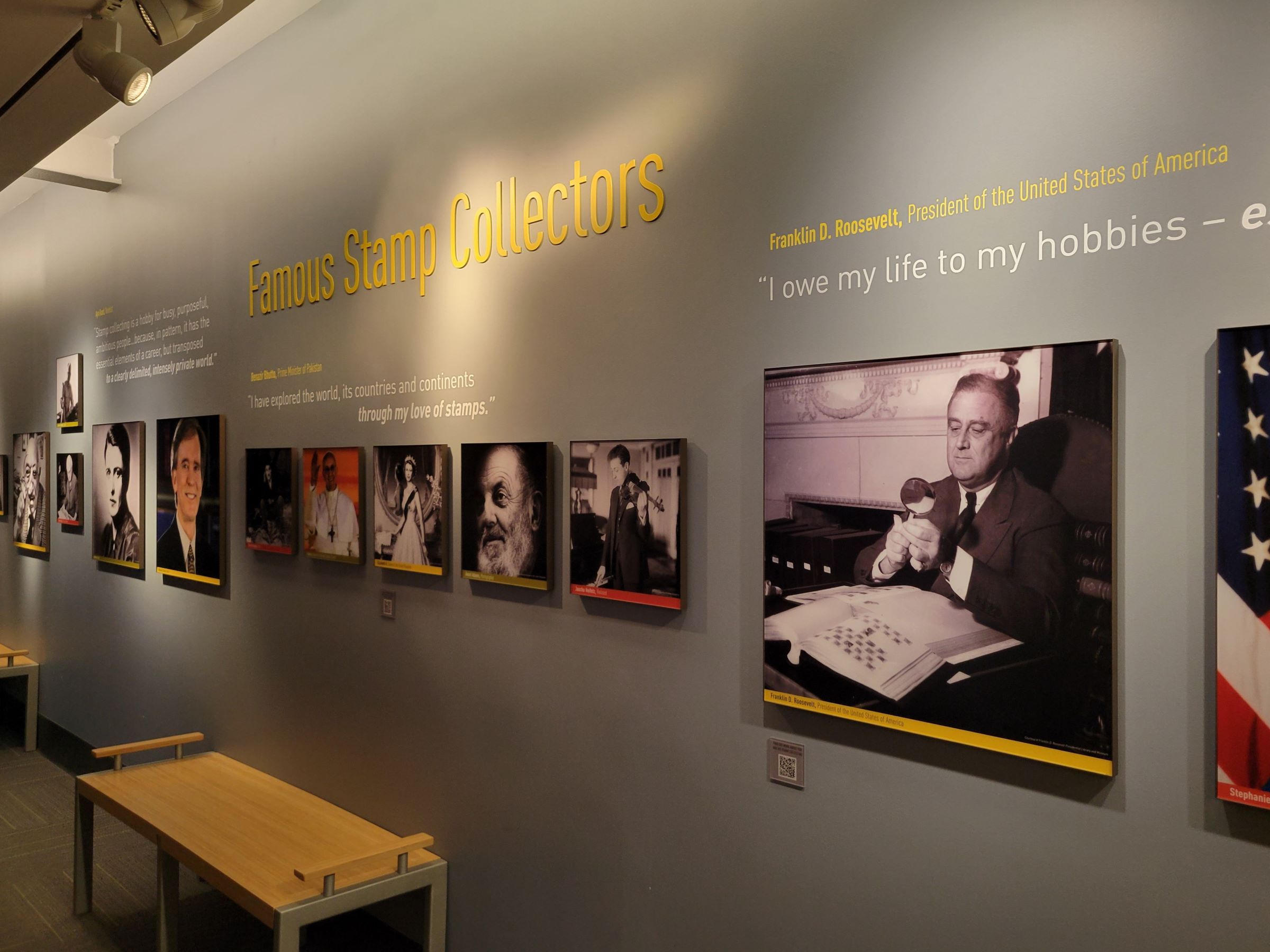 유명한 우표수집가들을 소개하는 곳에 루스벨트 대통령의 사진이 또 붙어 있는데, 그는 당대 최고의 '우표 덕후'였던 자신의 친구를 체신부 장관에 임명해서 우표의 도안까지 직접 관여할 정도였다고...^^ 그 외에 알만한 사람으로는 엘리자베스 여왕, 프란치스코 교황, 찰리 채플린 등의 사진이 보이며, 이 방에 존 레논의 어릴 적 우표수집책도 전시되어 있다.