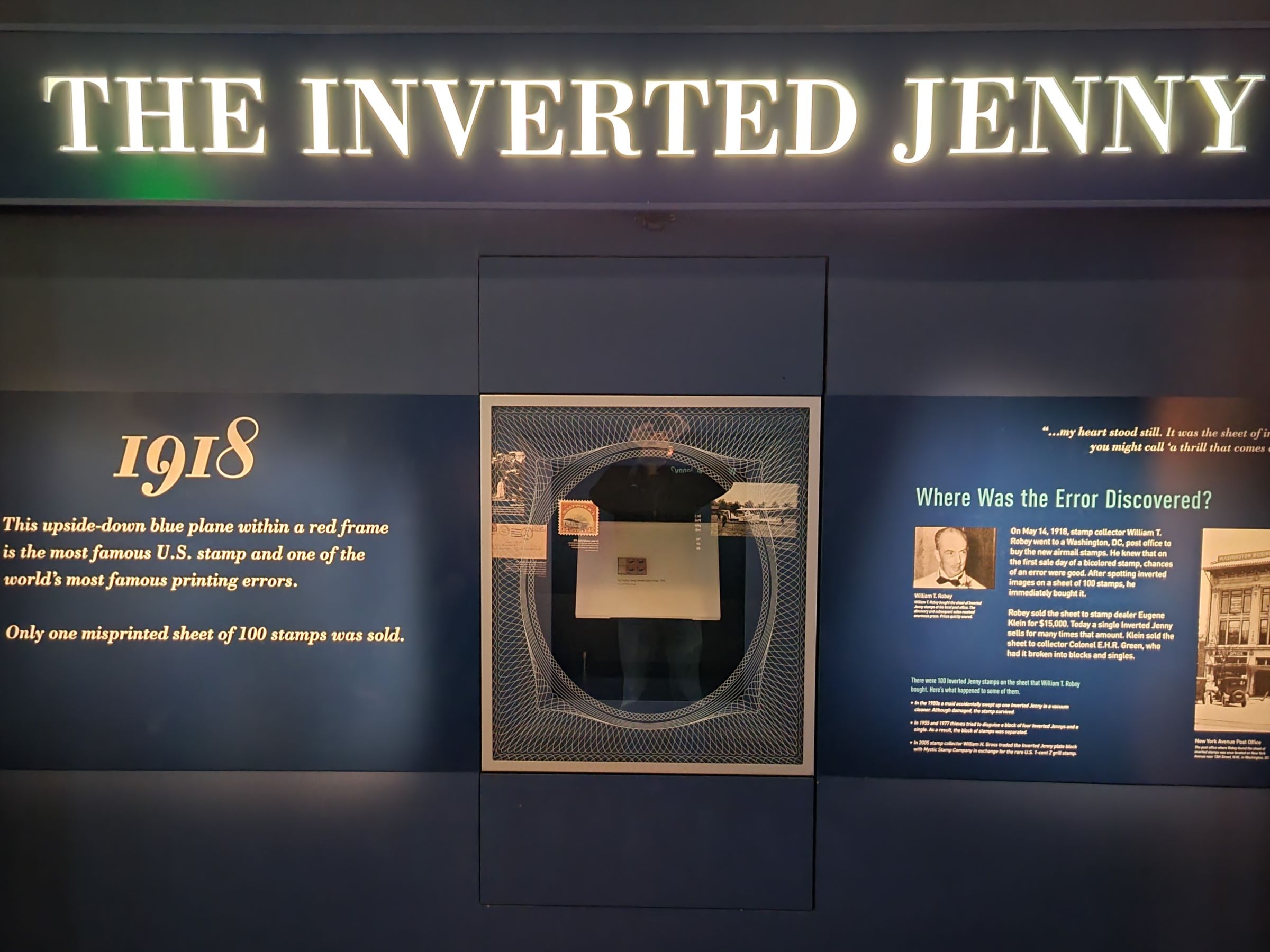 전세계에 정확히 100개가 남아있다는 1918년의 '뒤집어진 제니(Inverted Jenny)' 우표로, 작년 2023년에 1개가 약 200만불에 거래가 되어서 뉴스에 나오기도 했었다. 우표의 색이 바래는 것을 막기 위해서 가운데 전시창 내부의 조명이 잠시만 약하게 들어왔다 꺼지기를 반복하기 때문에 직접 사진을 찍는게 쉽지 않았던 실물 사진을 보여드리면,