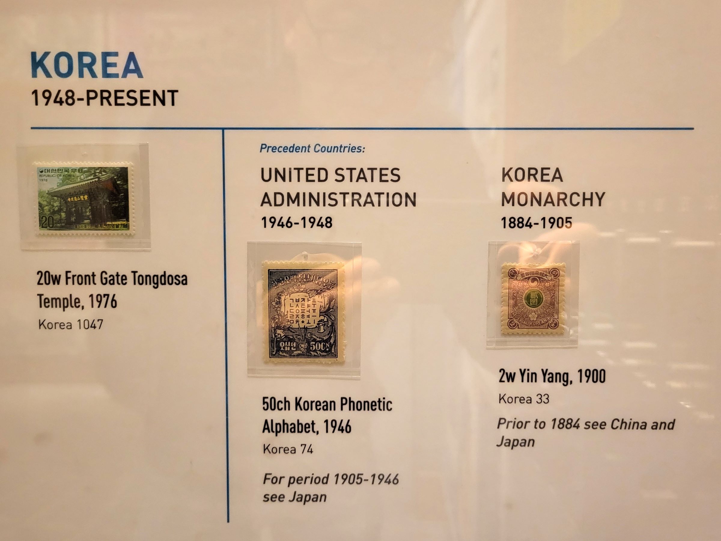 1900년 대한제국 2원 우표, 1946년 미군정 당시 발행된 50전 한글오백주년기념우표, 그리고 1976년 세계관광의날 기념우표 20원짜리인데, 마지막 우표의 일련번호가 'Korea 1047'인 것을 보면, 한국의 우표만 1천장 이상을 이 박물관에서 소장하고 있는 것으로 생각된다.