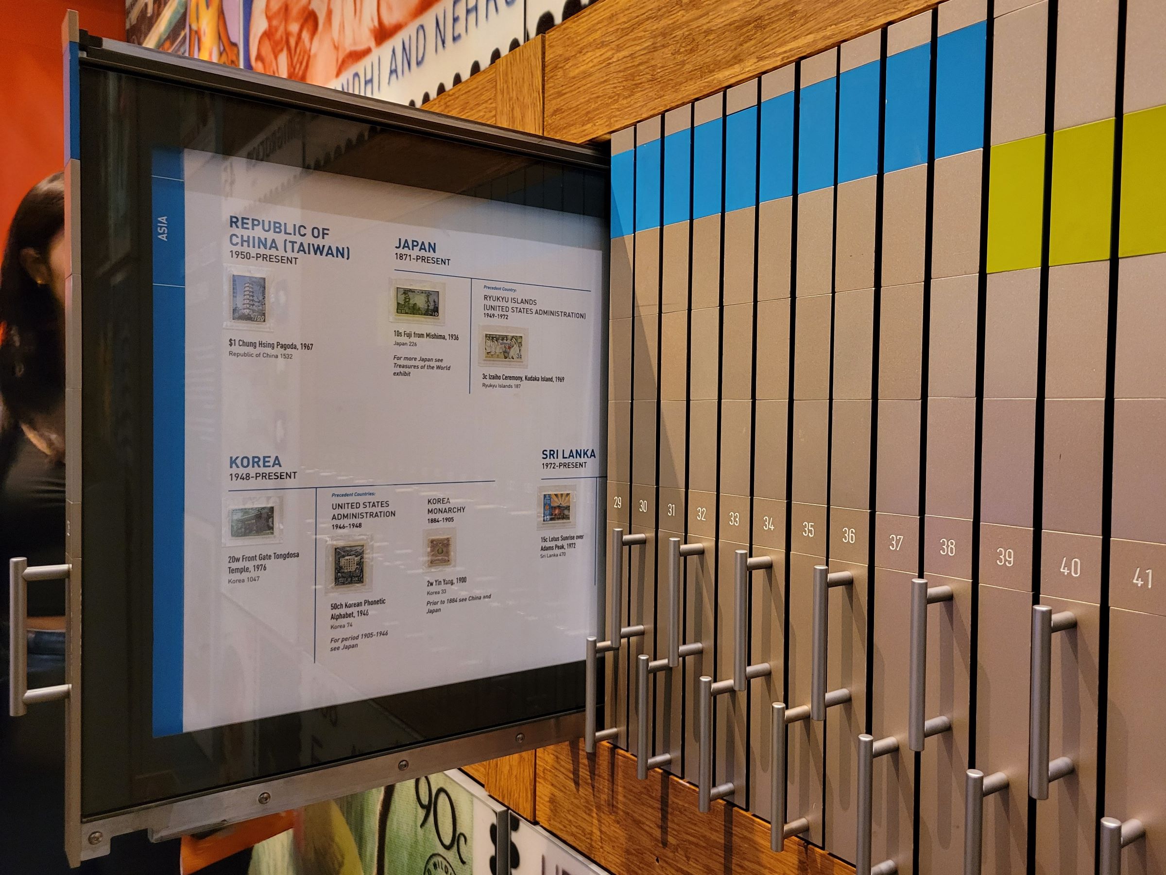 우표라는게 크지가 않아서 실물보다는 확대한 프린트나 계속 바뀌는 화면으로 보여주기만 하는 것이 아닐까 하는 생각이 처음 여기서 들었지만, 작은 실물들도 나중에 원하면 얼마든지 찾아볼 수 있게 만들어져 있다. 이 사진 오른편에 FIRST U.S. STAMPS라 된 곳을 자세히 보면,