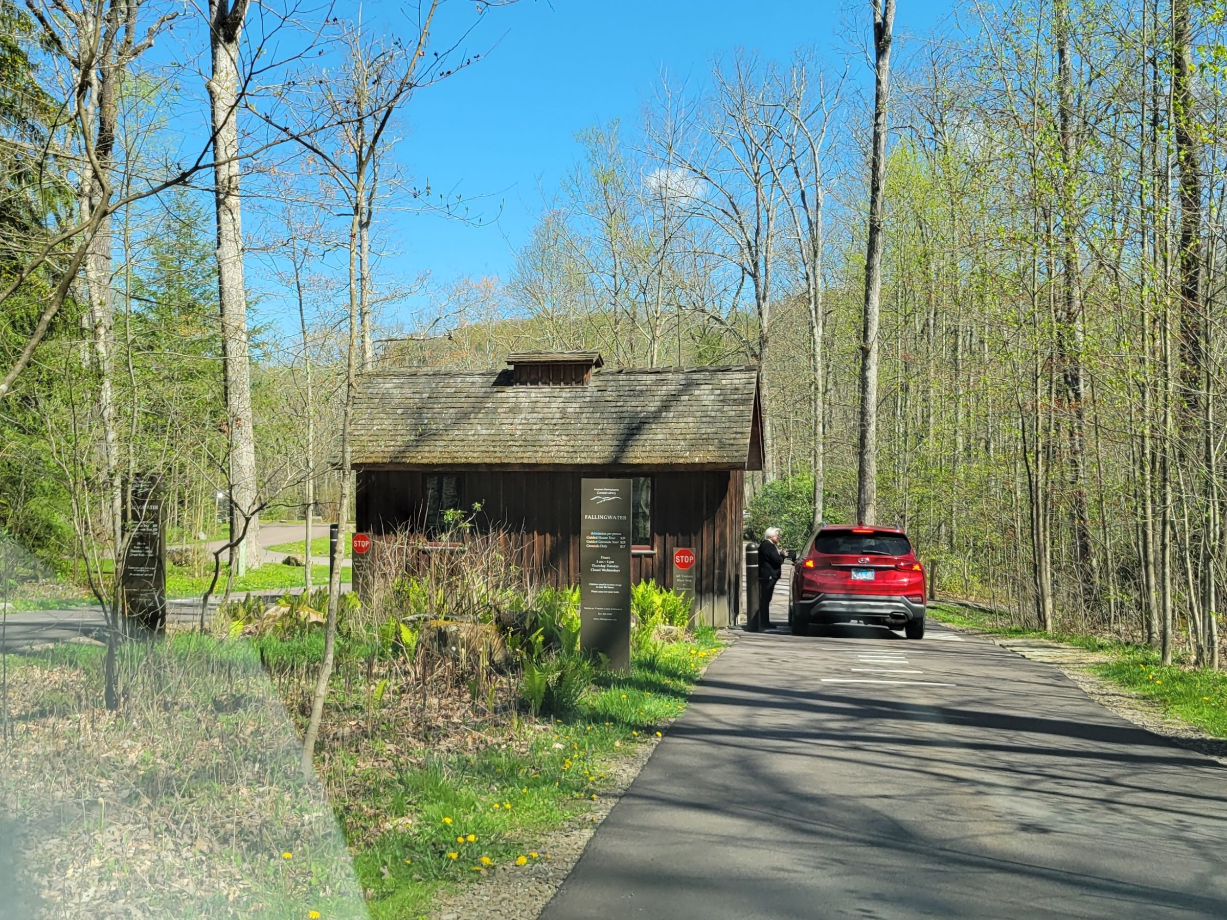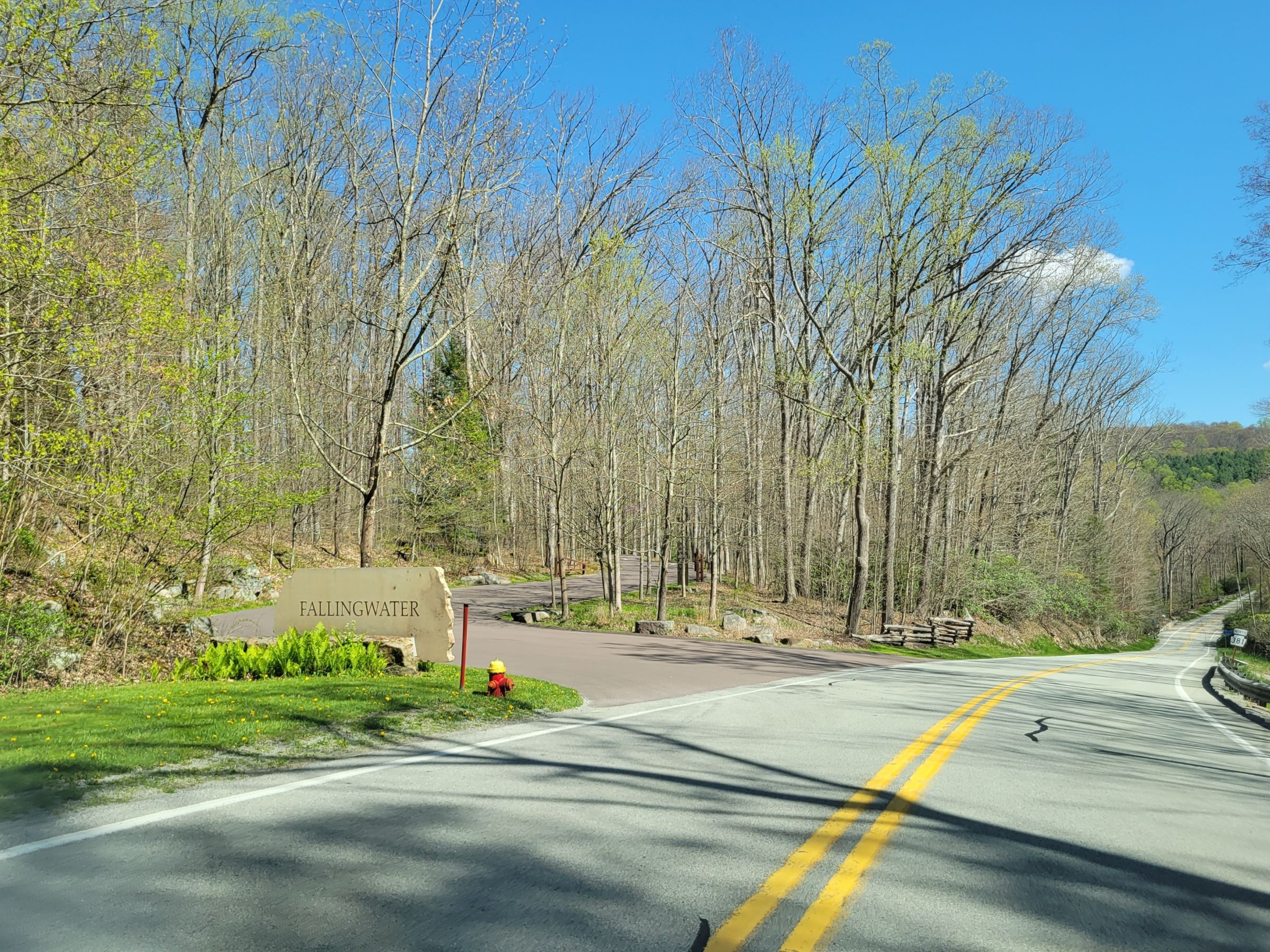 오하이오파일 주립공원(Ohiopyle State Park)으로 지정된 숲을 달리다가 간판이 세워진 진입로로 들어가기 직전이다. 여기 남서부 펜실베니아는 우리 동네보다 위도가 좀 높고 내륙이라서 그런지, 이제서야 나무에 연두색 새순이 올라오고 있었다.